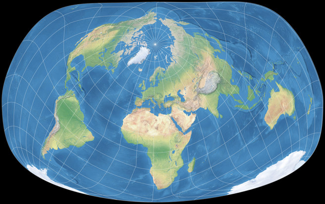 Für die Darstellung im Kalender habe ich eine geringfügig modifizierte Version von Natural Earth II with Shaded Relief, Water, and Drainages verwendet. Auf Bertin-Rivière projiziert mit G.Projector.