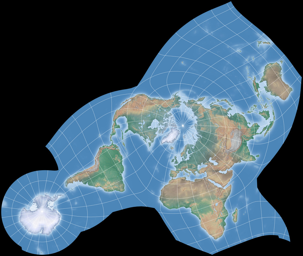 Die letzte Projektion dieses Jahres ist definitiv die ungewöhnlichste des Kalenders. Sie wurde 2019 von Justin Kunimune entwickelt und zielt auf niedrige Verzerrungswerte ab, besonders auf den Landflächen; während sie die üblichen Konventionen wir Symmetrie oder äquatorialer Ausrichtung fallen lässt. Es ist natürlich nicht die erste Projektion dieser Art, aber sicherlich die erste mit einer solche hübschen organischen Form.