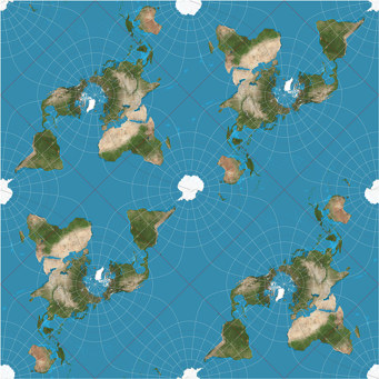 Für die Peirce-Quincunx-Darstellung im Kalender habe ich eine geringfügig modifizierte Version von Natural Earth II with Shaded Relief, Water, and Drainages verwendet. Projiziert mit Geocart.