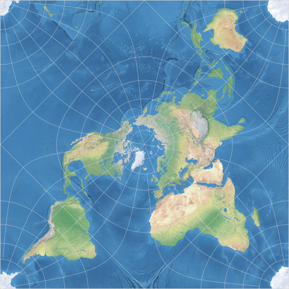 Wenn Du, aus welchen Gründen auch immer, eine quadratische Weltkarte brauchst – nun, es gibt auch andere quadratische Projektionen, wie den beschnittenen Mercator (die unten gezeigte Mercator-Darstellung ist bei 84° Nord/Süd beschnitten, für eine exakt quadratische Karte setze die Begrenzung auf 85°3′4.0636″ / 85,051129°) oder Gringorten, Adams I und II sowie Toblers Abbildung in einem Quadrat und die rechteckige Plattkarte mit Schnittparallelen auf 60° Nord/Süd. Aber der Peirce ist sicherlich eine gute Wahl: Wegen seiner auffallenden Einzigartigkeit eignet er sich gut für dekorative Karten, aber er kann auch noch bestehen, wenn auf der Karte Informationen vermittelt werden sollen.