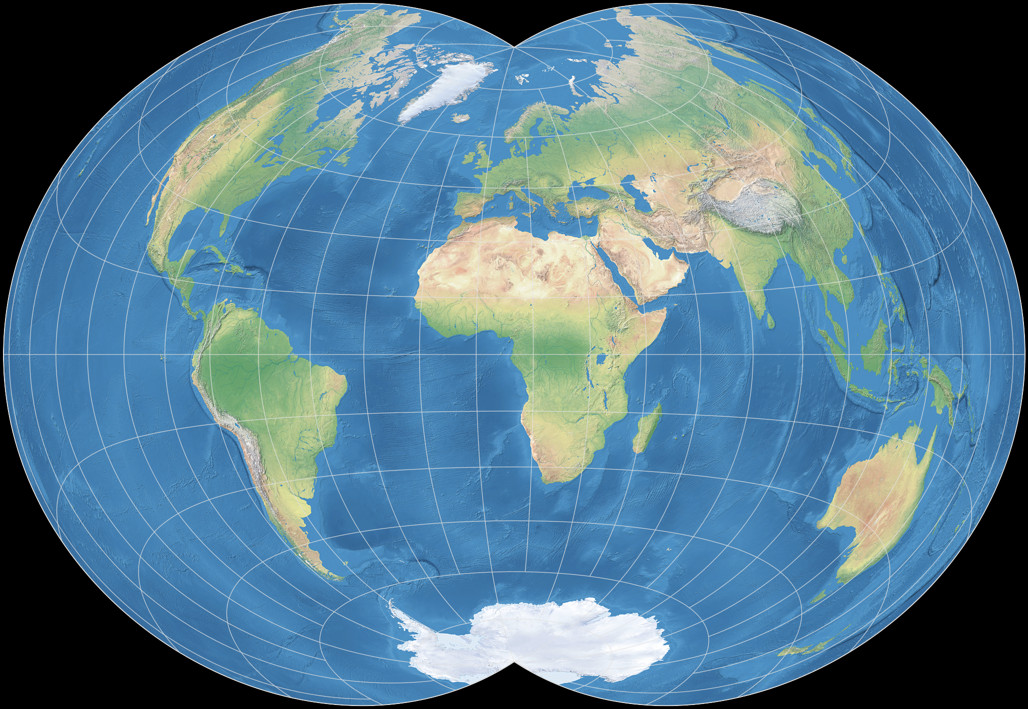 Für die Darstellung im Kalender habe ich eine geringfügig modifizierte Version von Natural Earth II with Shaded Relief, Water, and Drainages verwendet. Projiziert mit Geocart.