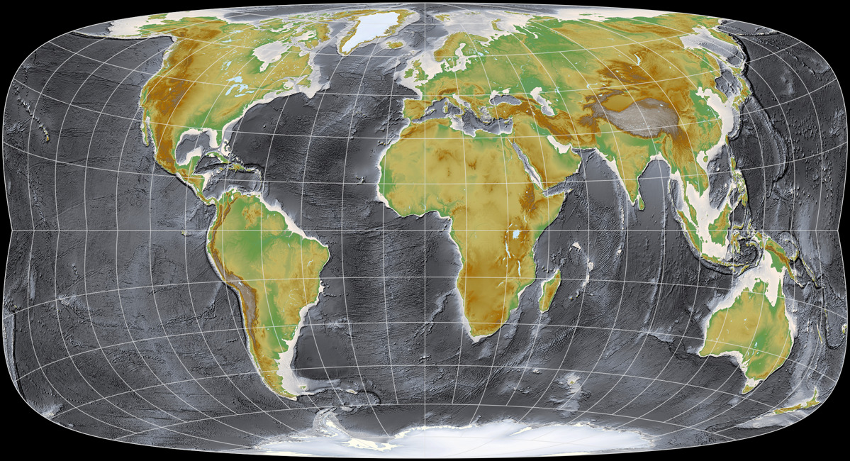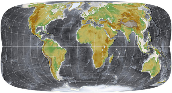 Und manchmal ist es sogar ein bisschen vermessen, von »meinem« Experiment zu sprechen. Zum Beispiel bei der Titelbild-Projektion oben: Als daan Strebe sie entwickelt hat, sah er einen Konfigurations-Parameter mit der Bezeichnung Bonne φ1 vor. Und ich habe nichts weiter getan, als dort einen bestimmten Wert (nämlich 24° Süd) einzutragen, welcher eine Variante erzeugte, die sich deutlich von der voreingestellten Projektion unterschied. Das ist nicht gerade viel kreative Arbeit meinerseits, nicht wahr?