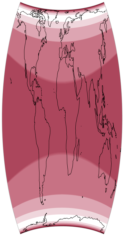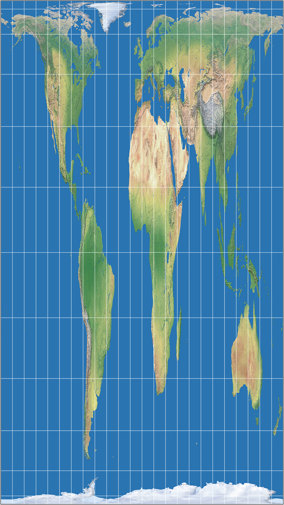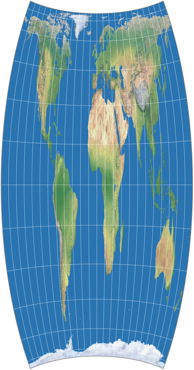 In einer vielbeachteten Publikation, die Ende 2014 mit einer Auflagenstärke von 3 erschien, habe ich Jung’s Superfluous Cylindrical Equal-area vorgestellt – siehe rechts oder oben (je nachdem, mit was für einem Gerät du diese Seite liest): Mir war aufgefallen, dass keine der benannten flächentreuen Zylinderprojektionen – weder Behrmann noch Gall-Peters, nicht einmal Toblers Abbildung in einem Quadrat – die polaren Gebiete gut darstellen: Grönland, zum Beispiel, wird immer furchtbar in Nord-Süd-Richtung zusammengequetscht.
