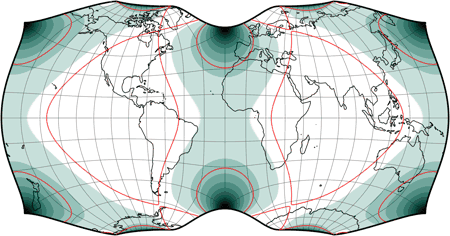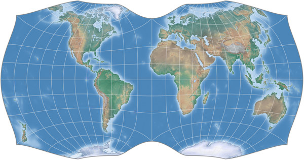 P.P.S.: Dies ist nicht die erste öffentliche Vorstellung des Guyou-Wagner, ich habe den Entwurf erstmalig gezeigt im (englischen) “Experimental projections”-Thread des mapthematics-Forums. Ein höchst empfehlenswerter Thread, denn es werden einige sehr interessante Projektionen gezeigt.