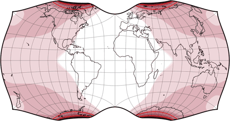 | Anmerkungen | Gewichtetes arithmetisches Mittel der Guyou- und der Wagner VII-Projektion. |