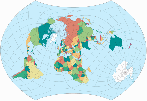 Frančula XIII ist eine aphylaktische, lentikuläre Projektion mit einer Pol-Linie und gleichabständigen Breitenkreise entlang des Zentralmeridians – genau wie Winkel Tripel Bartholomew (Juli) und Canters W09 (September). Vielleicht habe ich es im Kalender also ein bisschen übertrieben mit dieser Kategorie, aber ich finde nun einmal, dass sie sich sehr gut für politische Karten eignet.