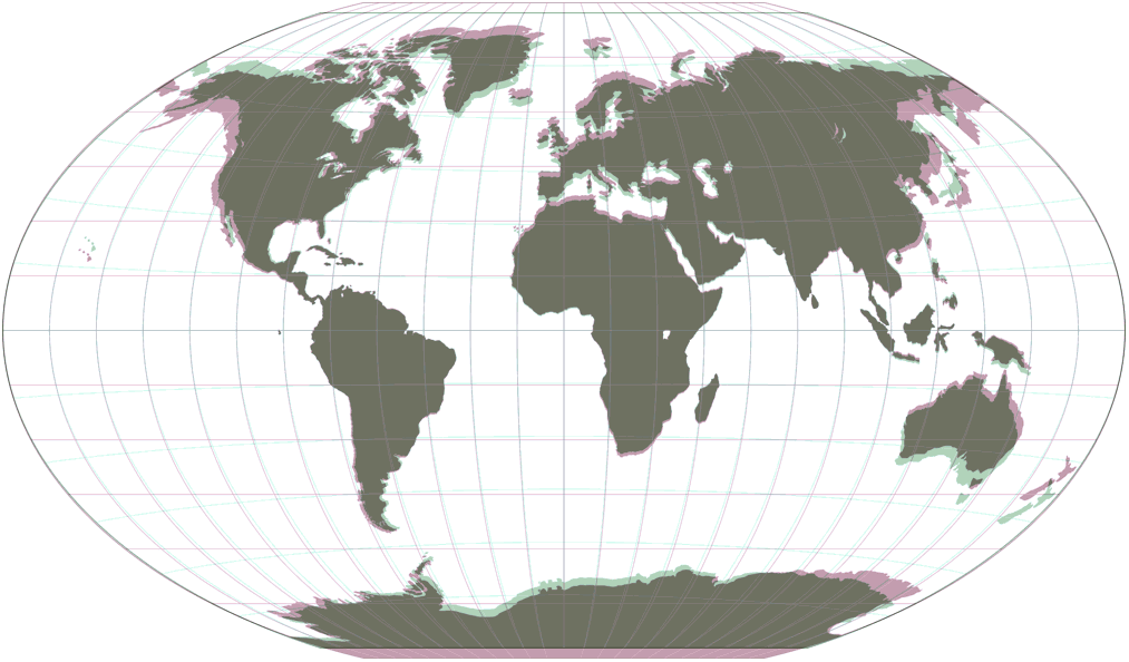 Frančula VII gefällt mir persönlich aufgrund der kurzen Pollinie besser als andere Projektionen dieses Typs, z.B. Wagner VI oder Eckert III. Der Grund, warum ich ihn in den Kalender aufgenommen habe, ist aber: Er sieht aus wie eine pseudozylindrische Version des Winkel Tripel Bartholomew, besonders wenn bei beiden auf gleiche Breite skaliert werden: