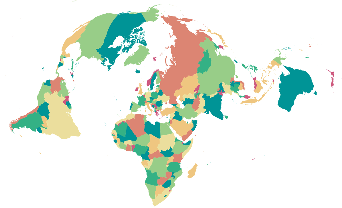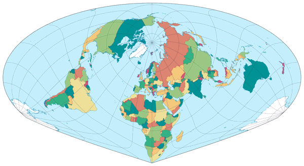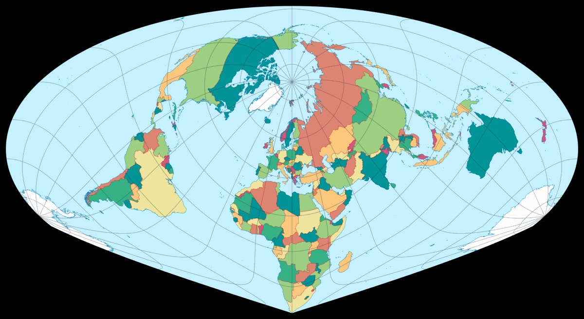 Ist es ratsam, eine derart ungewöhnliche Projektion für eine politische Karte zu nutzen? Vermutlich nicht in einem Atlas. Der Einsatz als Wandkarte bietet sich schon eher an: Selbst wenn man sie hauptsächlich als Informationsquelle nutzen will, kann es ja nicht schaden, wenn sie auch noch ansprechend aussieht, oder? Die relative Lage der Länder auf der Nordhalbkugel (oder vielleicht eher in der nördlichen Hälfte der Nordhalbkugel) zueinander wird besser dargestellt als auf den üblichen äquatorständigen Karten – das mag für verschiedene Artikel und Berichte hilfreich sein.