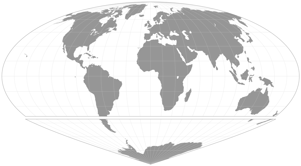 Vielleicht sind es ja diese geringen Winkelverzerrungen, die mir das Gefühl geben, dass selbst die OGABO-Version gut funktioniert. Vielleicht ist es aber auch nur die Tatsache, dass Afrika und Europa mittig bleiben und die Form, die ich das gewohnt bin, behalten. Keine Ahnung. Aber ich hatte erwartet, dass diese Darstellungsart gar nicht zur Sinu-Mollweide-Projektion passt – aber ich finde, das passt: