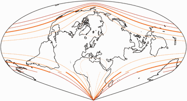 Die Sinu-Mollweide-Projektion hat aber noch weitere Vorzüge: Sie zeigt alle Kontinente außer Antarktika ohne Unterbrechungen und hat für eine flächentreue Projektion eine sehr vorteilhafte Verteilung von Winkelverzerrungen, fast alle Landflächen (abermals abgesehen von der Antarktis) bleiben unterhalb von 40°. Als visuell störend empfinde ich nur das spitze Südafrika.