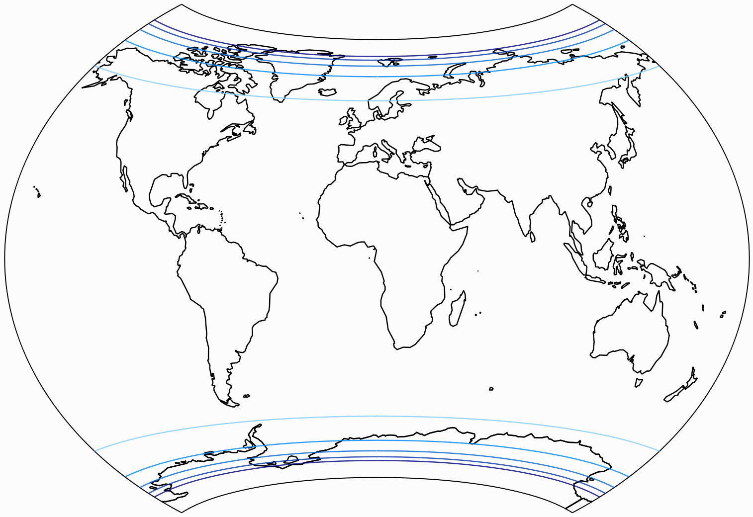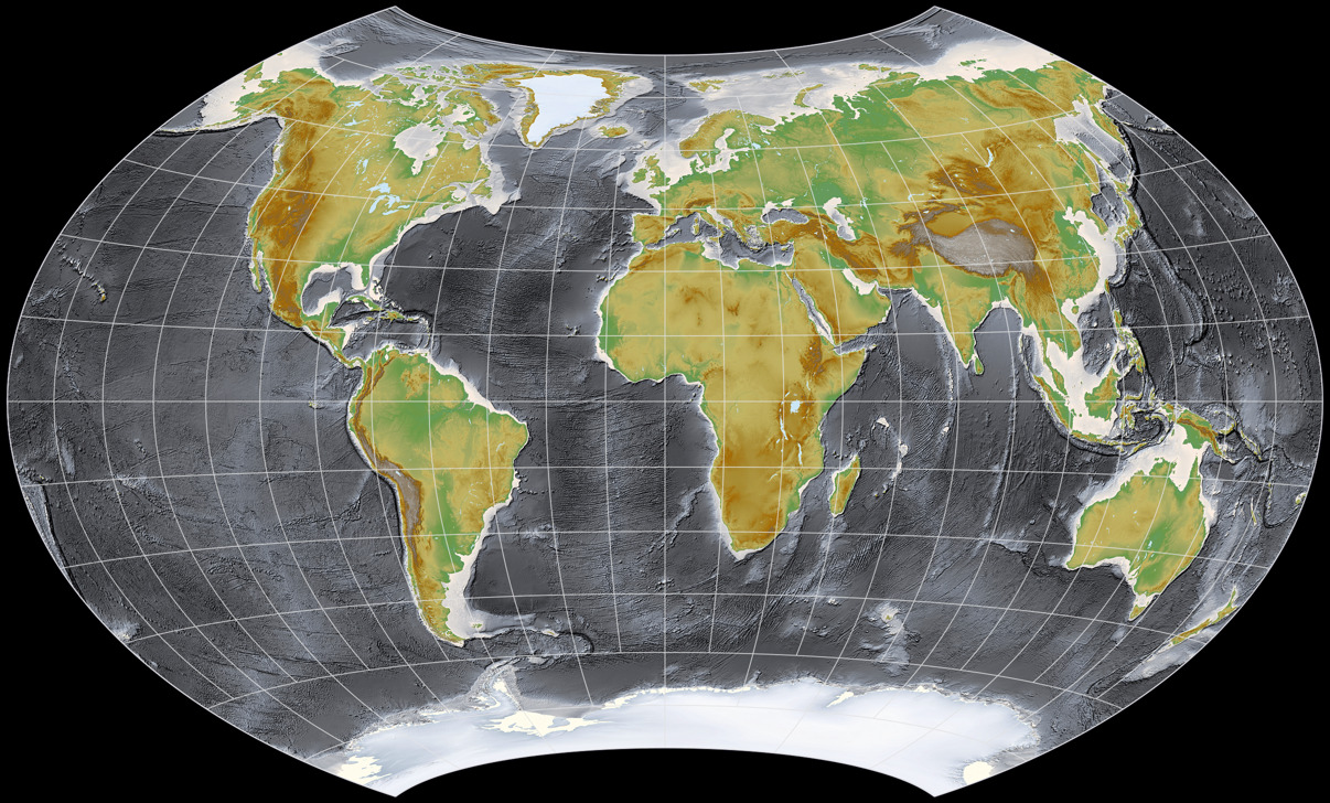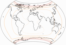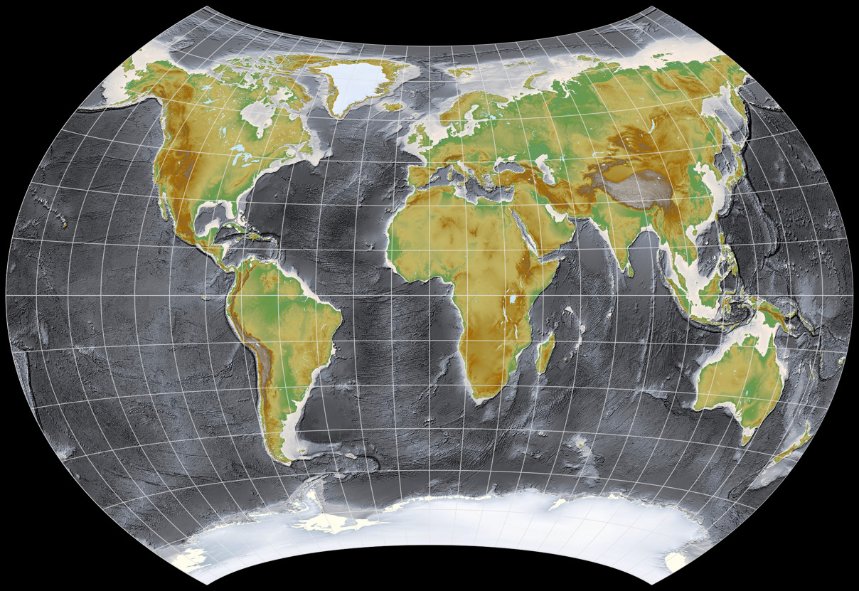 Letztes Jahr habe ich mich für diese Projektion entschieden, weil – nun, erstens schmuggle ich gerne den einen oder anderen meiner eigenen Entwürfe ein. 😉 Zweitens, weil der BCW-A I einen recht ordentlichen Q Wert hat: 82,4; womit er in Capeks Liste Platz 5 von 100 Projektionen einnehmen würde. Es stellte sich aber heraus, dass die Verzerrungswerte gemäß Goldberg & Gott sowie dem Airy-Kavrayskiy-Kriterium nicht soo großartig sind. Und also habe ich beschlossen, einfach ein wenig zu mogeln und so zu tun, als hätte ich eine bessere Projektion gezeigt …