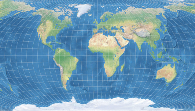 Normalerweise werden beide Varianten in ihrer »schüsselförmigen« Form gezeigt; aber oben sieht man eine rechteckige Form: Ich habe hier eine Darstellung gewählt, die man oft (wie ich im Februar 2020 erwähnt habe) beim van der Grinten I zu sehen bekommt: Die Projektion wird über ihre üblichen Begrenzungen hinaus erweitert, indem bestimmte Teile der Welt im Osten und Westen wiederholt werden, bis ein Rechteck vollflächig ausgefüllt wird.