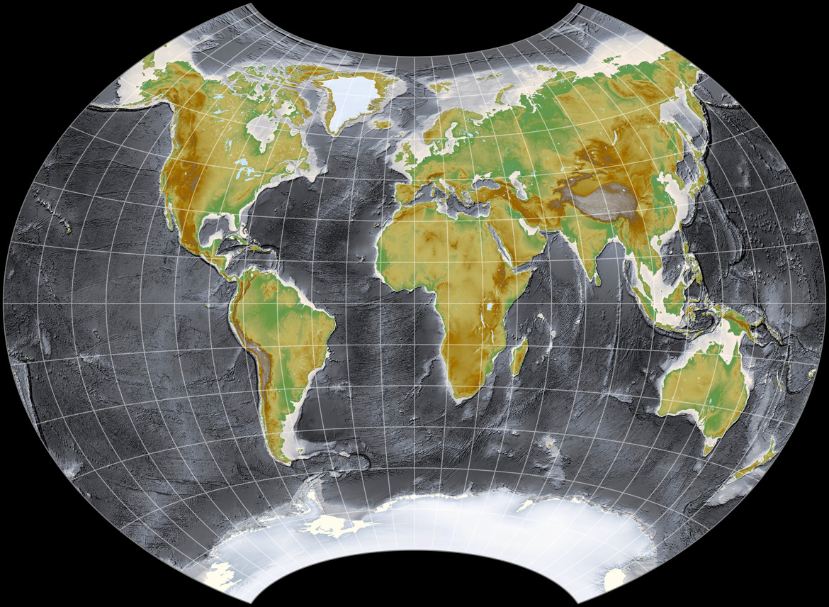 Bisher hatten wir also sieben Projektionen (inkl. der beiden vom Titelbild des Kalenders), die eher konventionell sind, d.h. sie sehen sehr nach Standard-Weltkarten aus. Es wird Zeit für eine ungewöhnliche: Die haben wir dann nächsten Monat.
