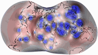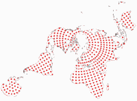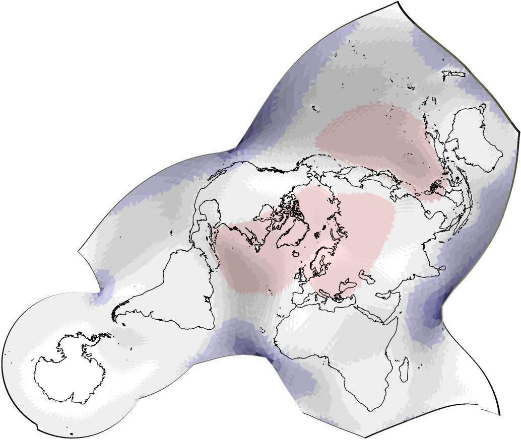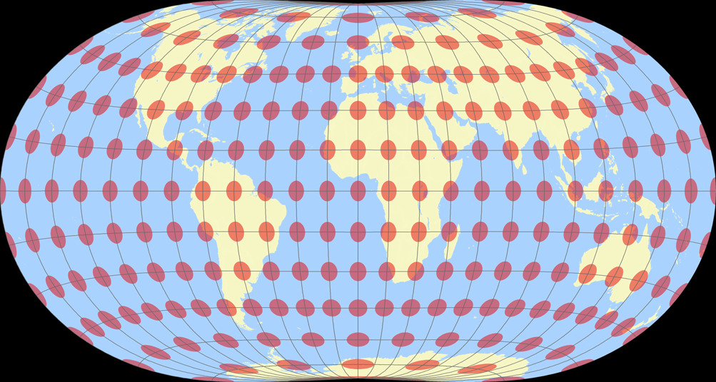 Anders als die ersten drei Projektionen, welche sich bemühen, die Verzerrungen über die gesamte Karte zu reduzieren, konzentriert sich Danseiji III ausschließlich auf die Landmassen, um die Verzerrungen so weit wie möglich in die Ozeane werfen – die einzige Art der Verklappung, die ich begrüße! Wie Du sehen kannst, verwirft der Entwurf auch jegliche Idee von Symmetrie und Regelmäßigkeit. Und erreicht tatsächlich sehr niedrige Verzerrungen auf Landflächen. Wieder einmal (wie bei den Canters-Projektionen) zeige ich eine Darstellung der Tissotschen Indikatrix nur auf Land, um Ablenkung durch die Verzerrungen im Meer oder die Außenform der Karte zu vermeiden: