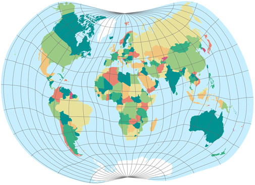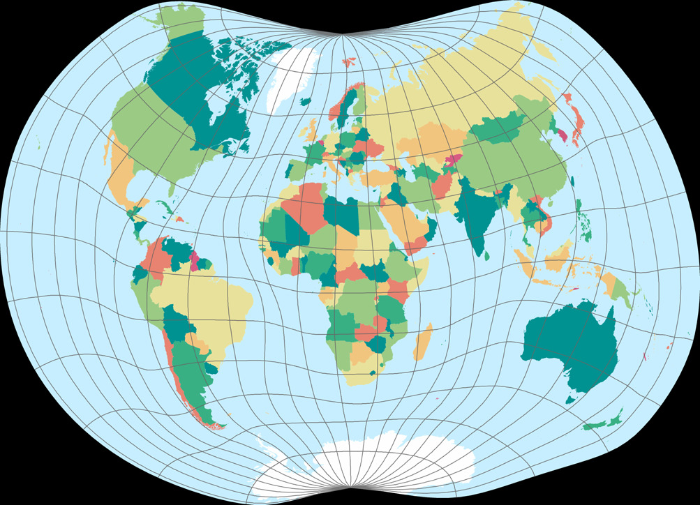 Der Danseiji N ist ein ziemlich »normaler« Entwurf für Weltkarten, nichts was einen gelegentlichen Kartennutzer verwirren würde. Es handelt sich um eine aphylaktische oder vermittelnde Projektion mit einer eher geringen Flächenvergrößerung. In Bezug auf die Verzerrungen vergleicht Kunimune ihn mit Winkel Tripel, Robinson und Wagner VIII, und ja, man kann sagen, dass sie in der gleichen Liga spielen. Genau wie diese drei ist Danseiji N in meinen Augen sehr gut für allgemein-geografische Weltkarten geeignet – aber im Gegensatz zu diesen verfügt er über punktförmige Pole, was realistischer ist und u.a. zu einer besseren Form von Grönland führt. Wer eine aphylaktische punktpolige[2] Projektion sucht, findet hier einen guten Kandidaten.