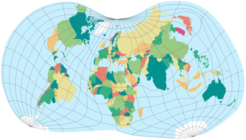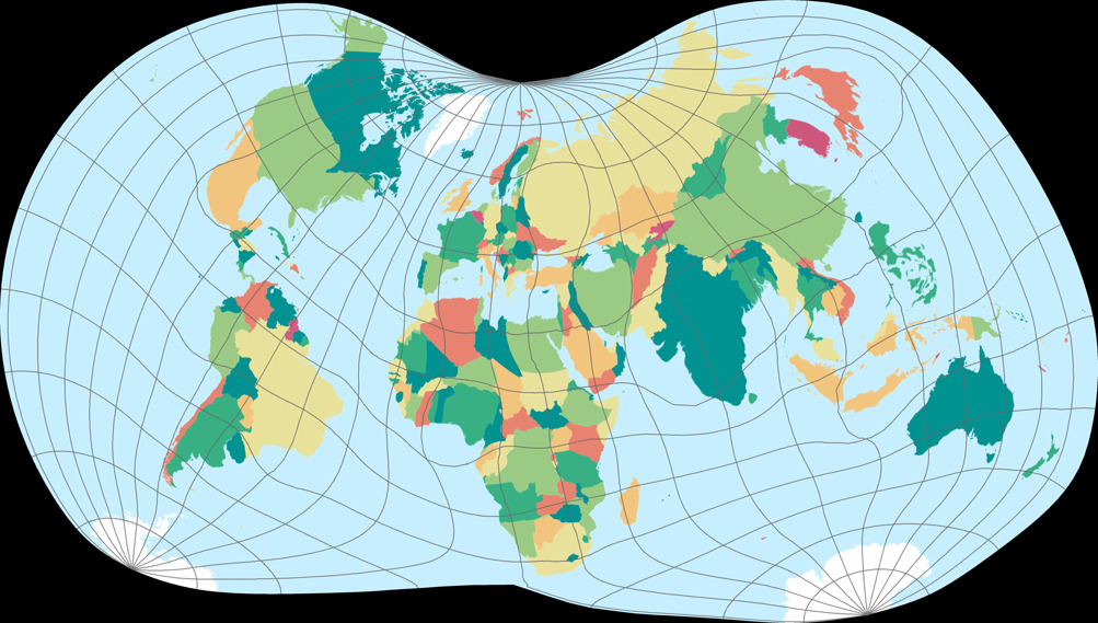 bei denen die Größe der Länder der Größe der Bevölkerungszahl entsprechen.
