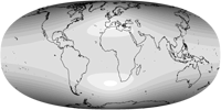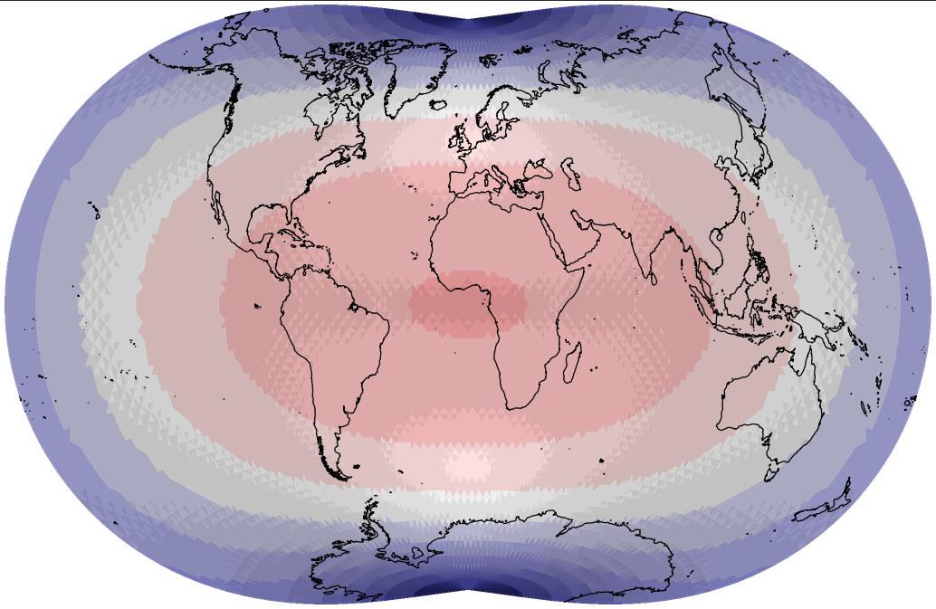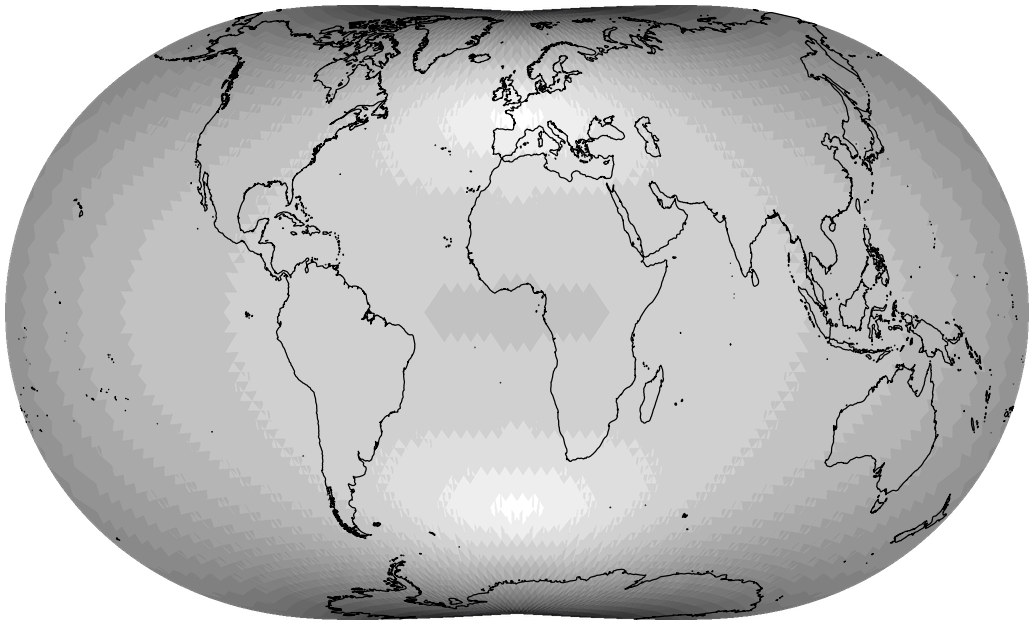 Hinweis: Wenn ich Kunimunes Abhandlung richtig verstehe, wird das Ursprungs-Netz nicht auf der Kugel erstellt, sondern auf einer existierenden Projektion, nämlich – im Falle von Kunimunes unten gezeigten Beispielen – der Hammer-Projektion bzw. der mittabstandstreuen Azimutalprojektion. Das spielt keine große Rolle, aber ich wollte es trotzdem erwähnen.