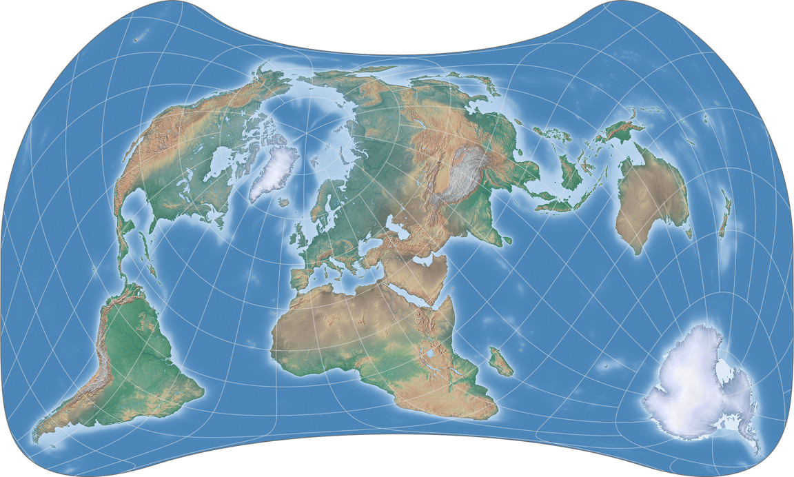 Danseiji III ist ein Entwurf mit erfreulich geringen Flächen- und Winkelverzerrungen der Landmassen. Seine Form ist ungewöhnlich, die Anordnung der Kontinente macht ihn aber trotzdem tauglich für viele Anwendungszwecke. Die Unregelmäßigkeiten im Gradnetz empfinde ich – rein ästhetisch gesehen – störender als die doppelte Asymmetrie. Tja nun … ein bisschen Schwund ist immer, gerade bei Kartenprojektionen. 😉