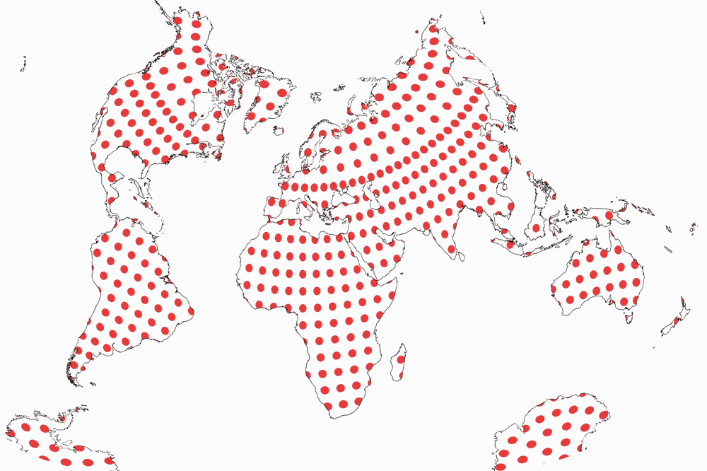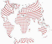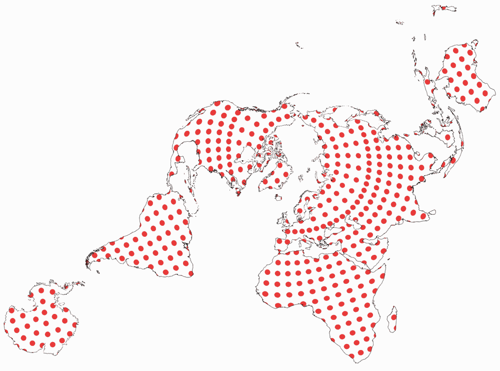 Anstelle des traditionellen Ansatzes, bei dem eine elegante mathematische Formel die Abbildung zwischen Kugel- und Ebenenkoordinaten beschreibt, besteht die Idee bei diesen Projektionen darin, ein Netz auf der Kugel zu erstellen und das Netz auf die Ebene abzubilden, indem jedem der Schnittpunkte eine Position zugewiesen wird. Die Abbildung kann manuell erfolgen oder durch eine Art Finite-Elemente-Algorithmus, der für die Optimierung beliebiger Bedingungen ausgelegt ist. Zum Beispiel könnte man die Kontinuität von Land bevorzugen oder die Verzerrung von Flächen oder Winkeln verringern – oder jede andere Regel, wie z.B. eine größere Fläche für Land gegenüber dem Ozean oder eine größere Fläche für stärker besiedelte Gebiete…