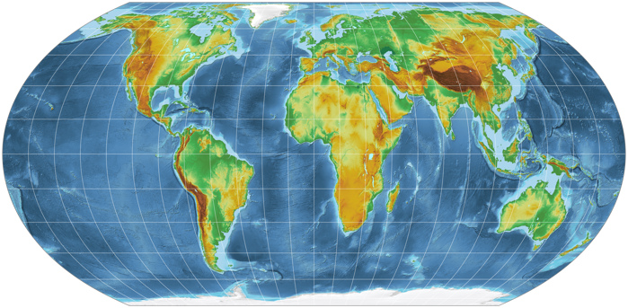 Aber es gibt einen anderen Kartennetzentwurf, der einen gewissen Bekanntheitsgrad erreichen konnte und höchstwahrscheinlich den meisten Leuten bekannt vorkommt: Die Robinson-Projektion, 1963 entworfen von Arthur H. Robinson. Sie gehört zur Gruppe der vermittelnden Projektionen, d.h. sie bewahrt weder die Größenverhältnisse, noch die Formen der Kontinente, sondern bemüht sich, einen Kompromiss auszubalancieren, der vor allem »korrekt aussieht«.