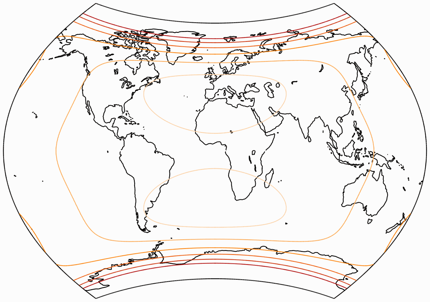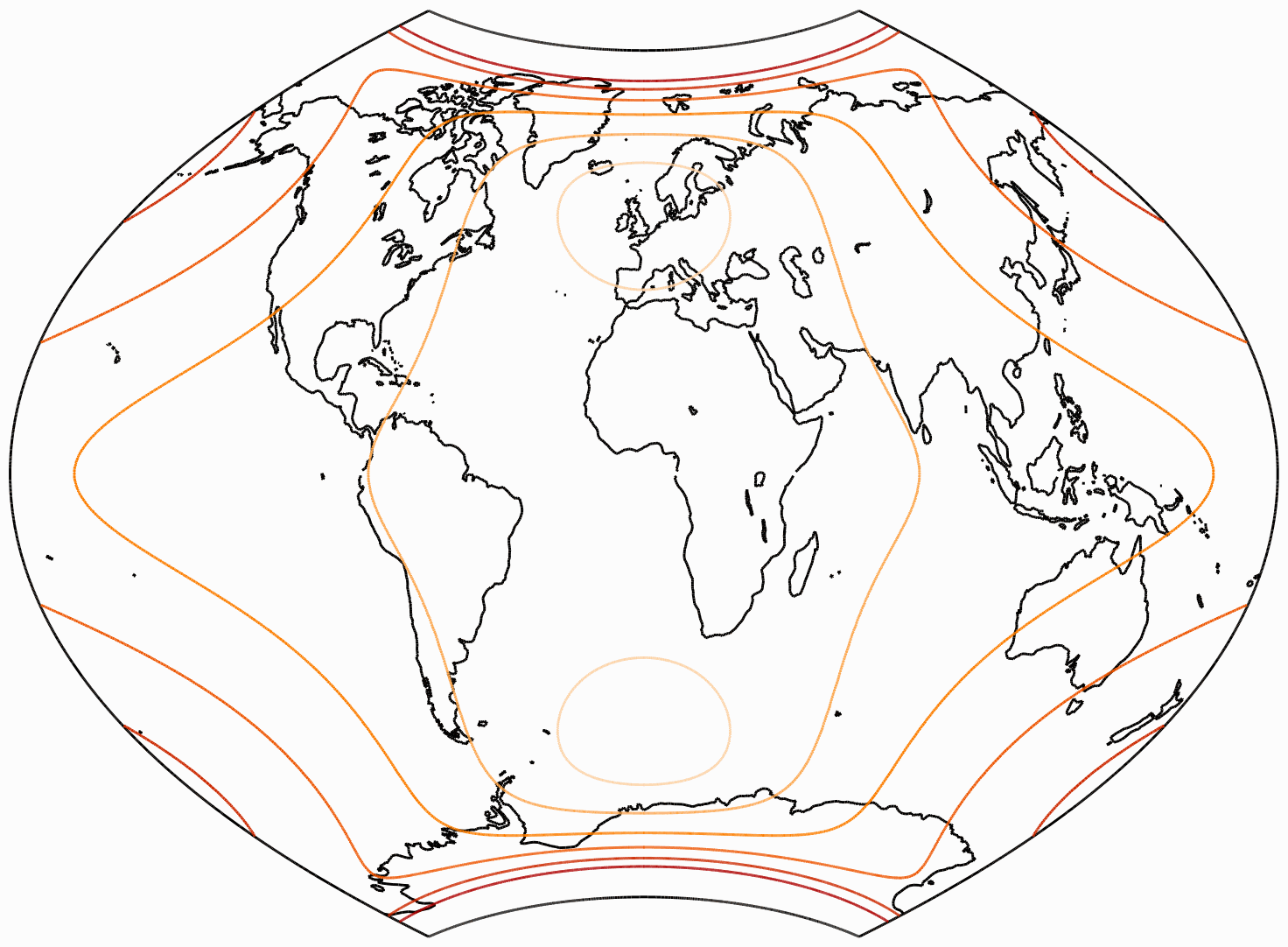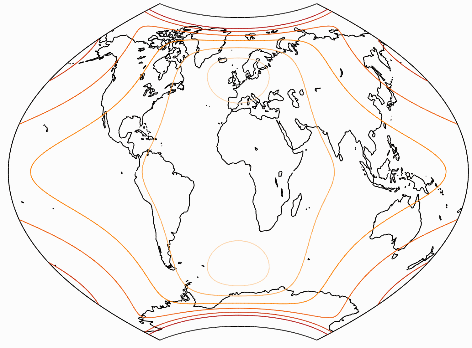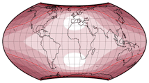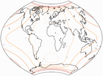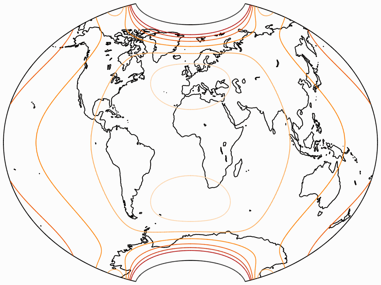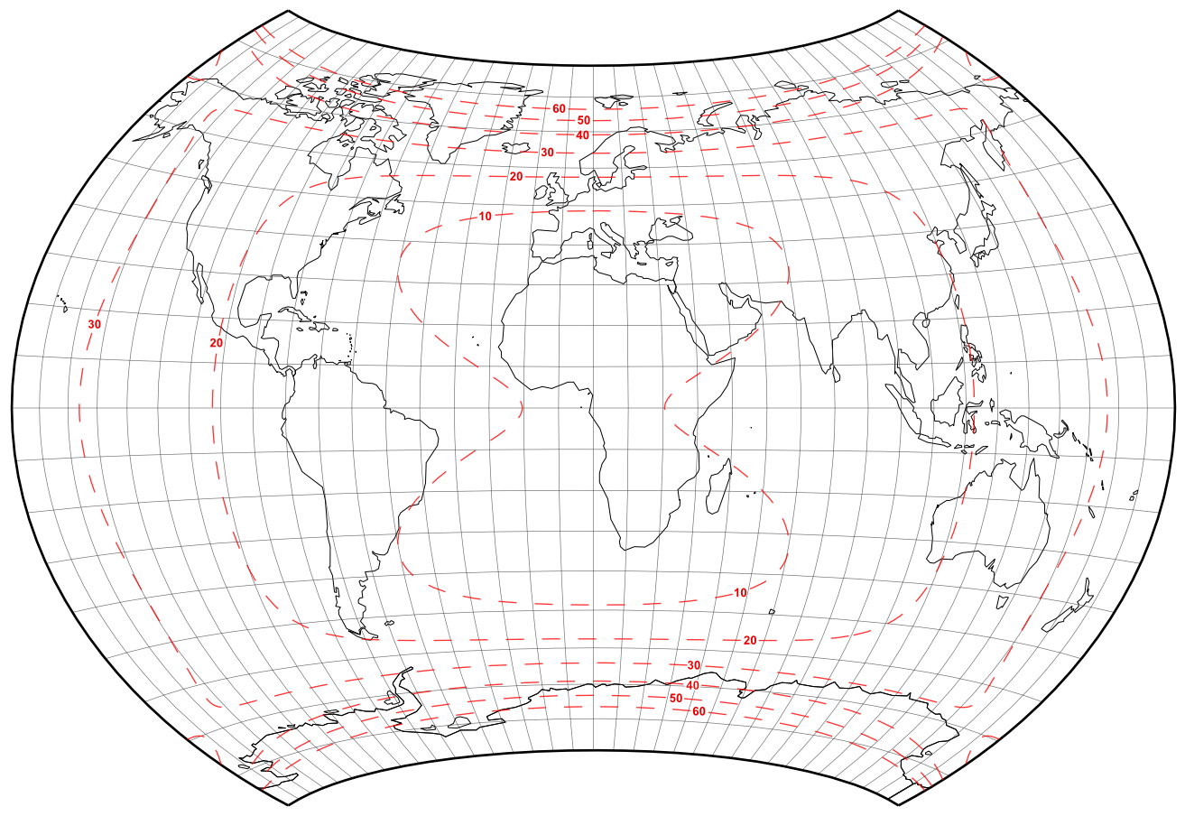 (…) Die Form der abgebildeten Erde im umbezifferten Aitoff und polykonischen Entwurf legt nahe, dass eine Projektion mit minimierten Verzerrungen, welche die Pole als Linie darstellt, eine Kontur mit konkaver Pollinie erzeugt. (…) Die ungewohnte Form der abgebildeten Erde verursacht, dass diese Projektionen nicht verwendet werden.