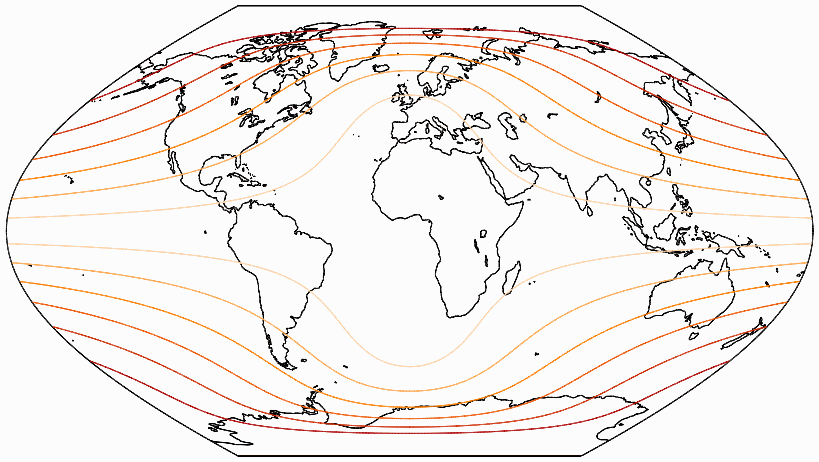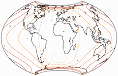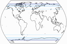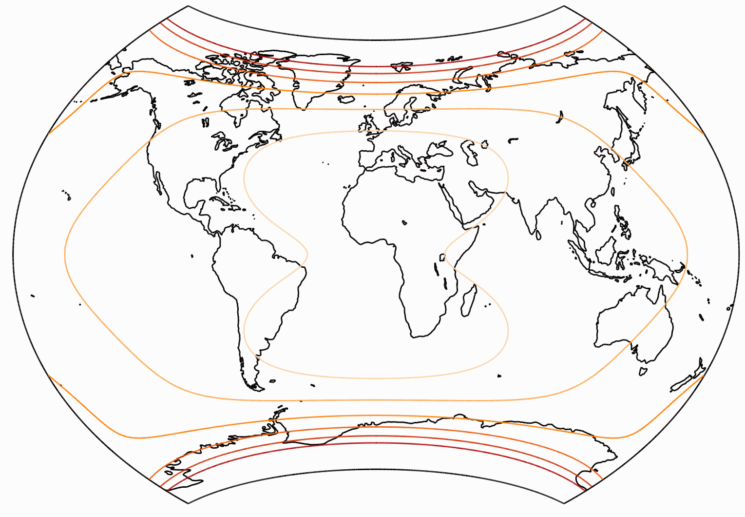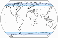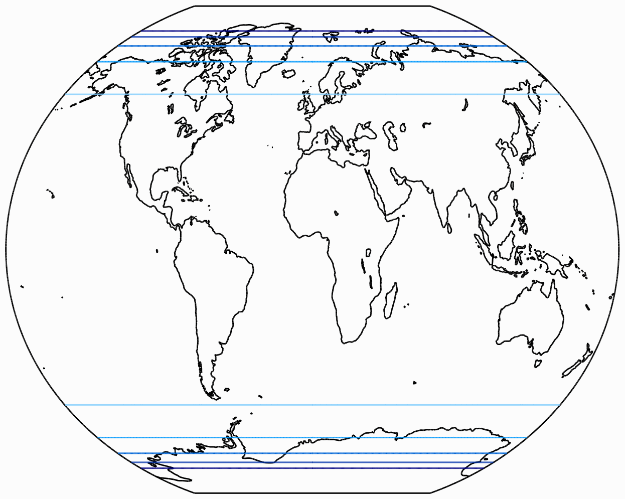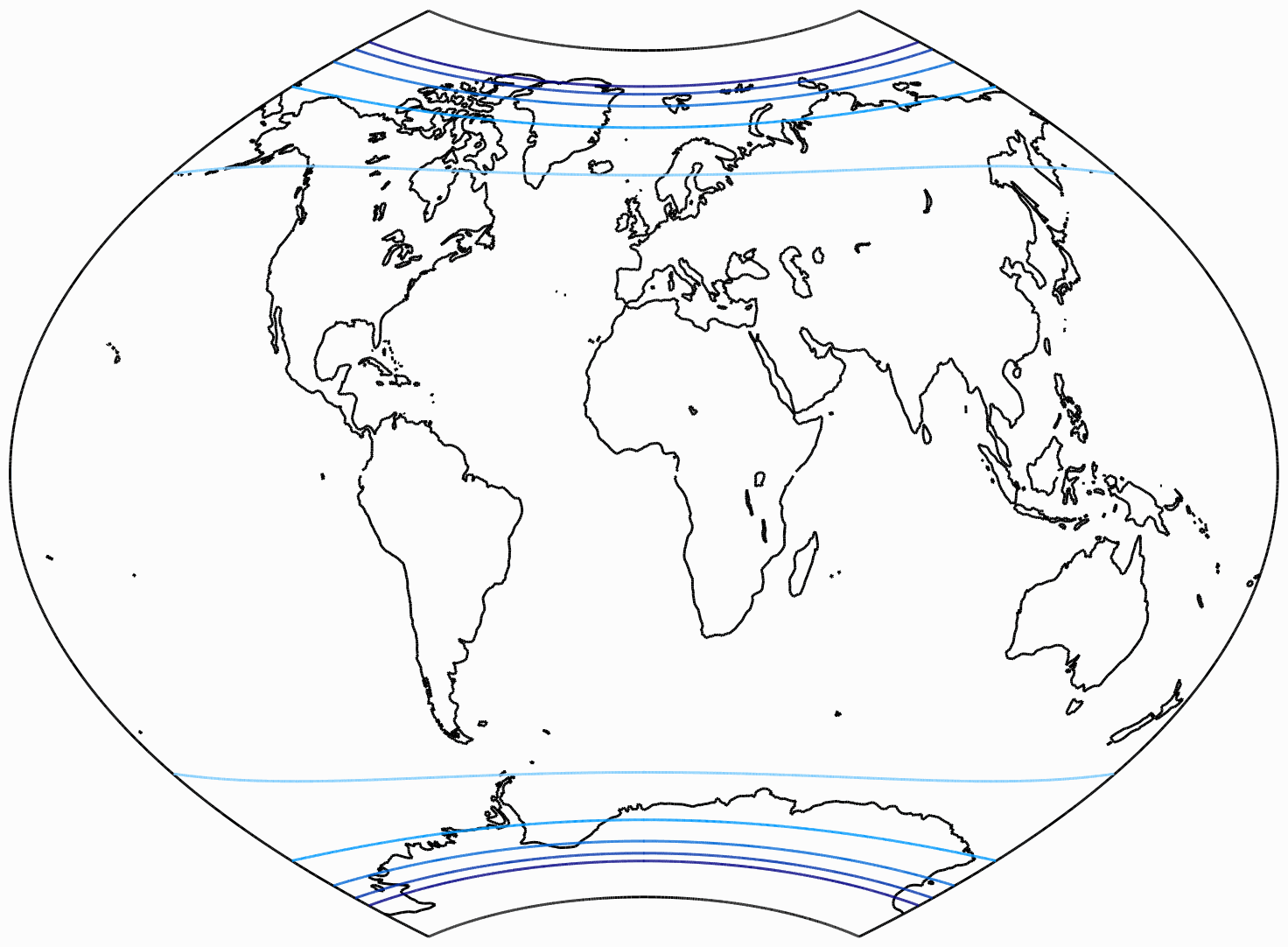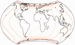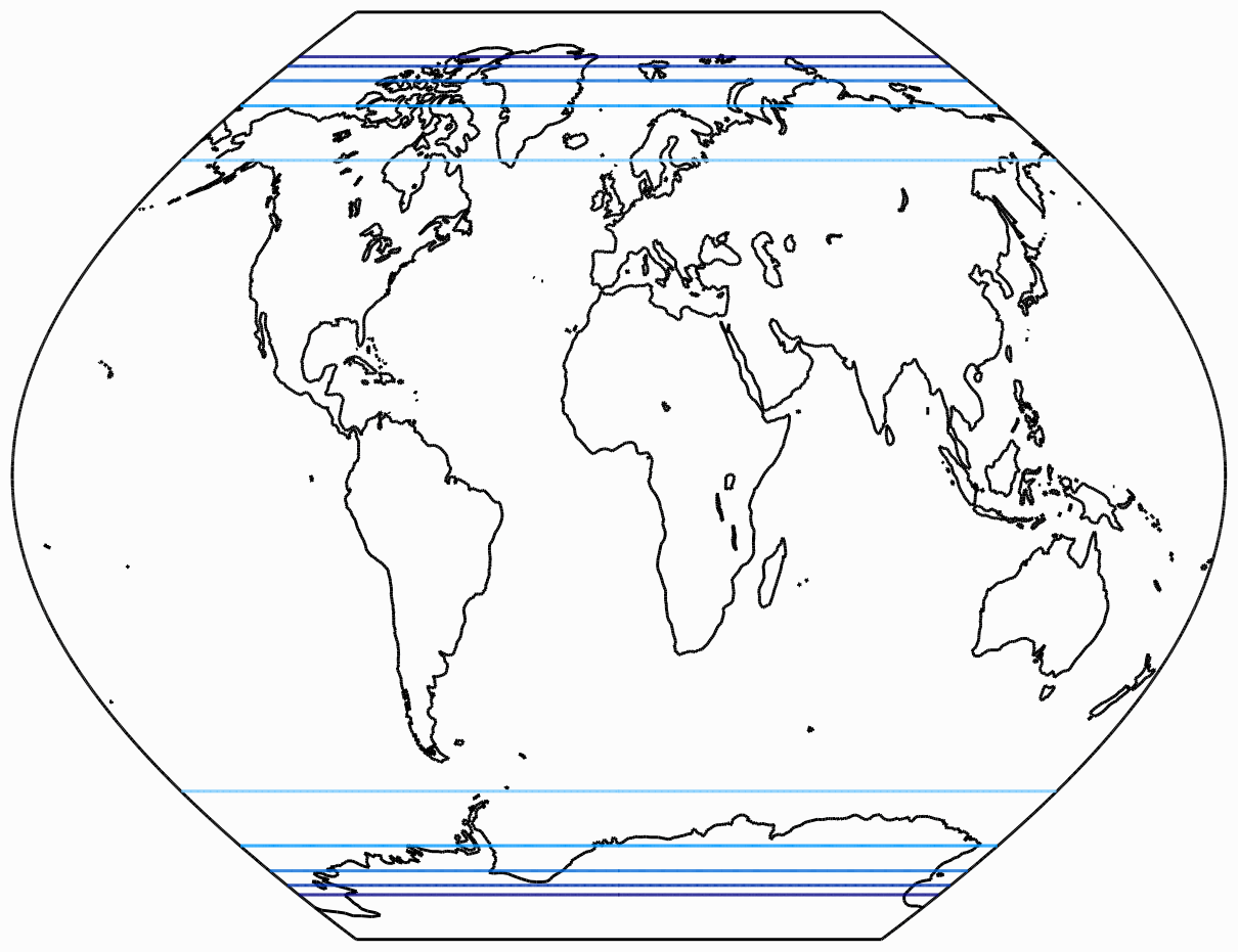 (…) Die Form der abgebildeten Erde im umbezifferten Aitoff und polykonischen Entwurf legt nahe, dass eine Projektion mit minimierten Verzerrungen, welche die Pole als Linie darstellt, eine Kontur mit konkaver Pollinie erzeugt. (…) Die ungewohnte Form der abgebildeten Erde verursacht, dass diese Projektionen nicht verwendet werden.