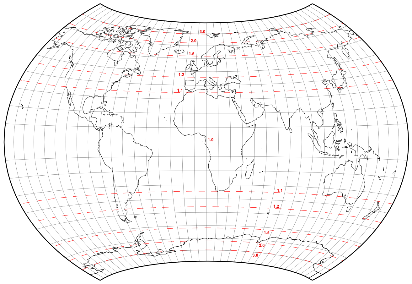 Die flächentreuen Projektionen Frančula V und XIV werden hier natürlich weggelassen. Bitte beachte, dass die Linien im Verhältnis zum Wert in der Mitte der Karte berechnet wurden! Meistens werden sie im Verhältnis zum nominellen Maßstab der Karte gezeigt. Sie werden gezeigt für eine Flächenvergrößerung von: