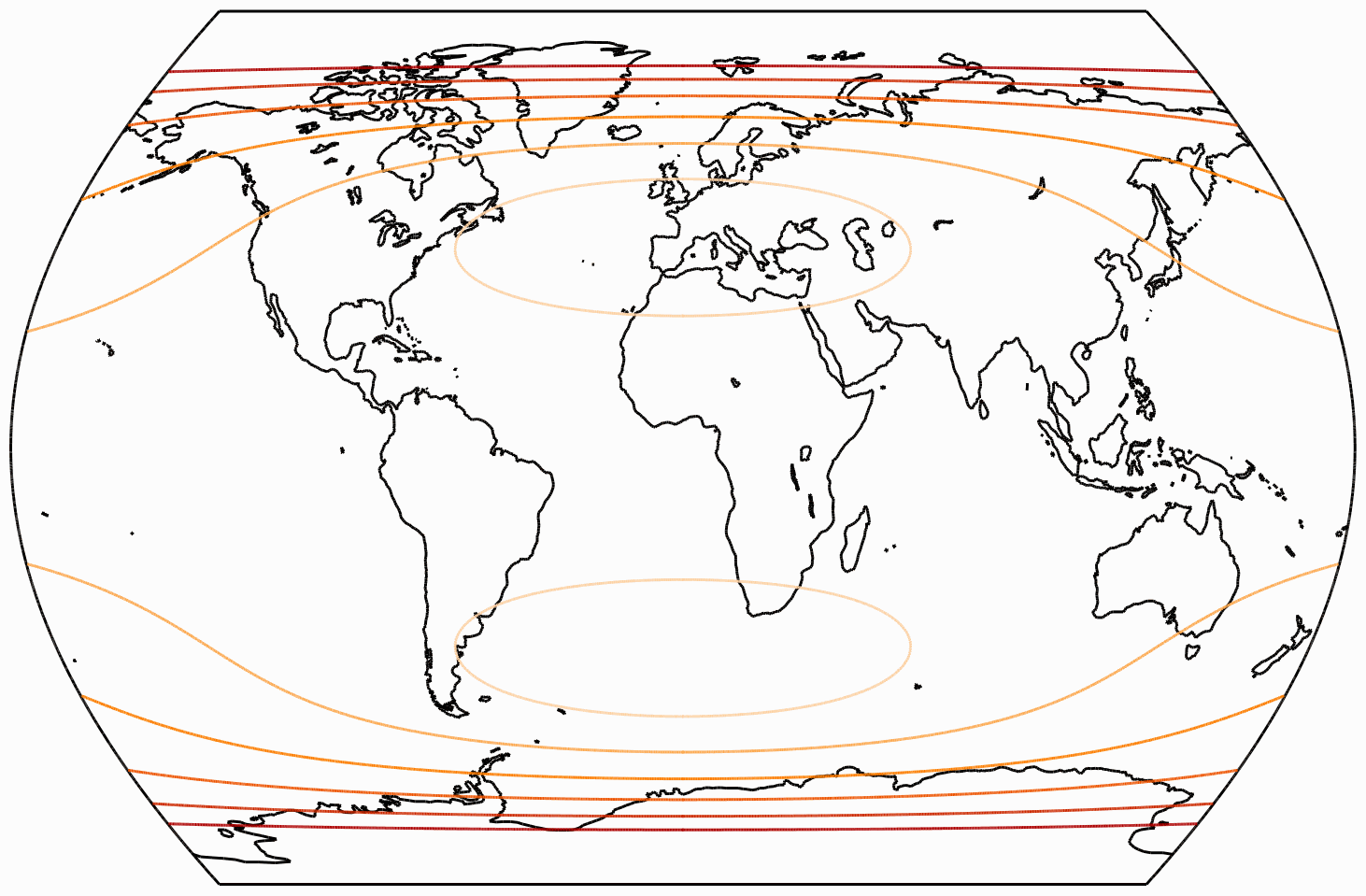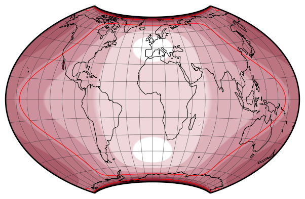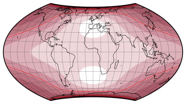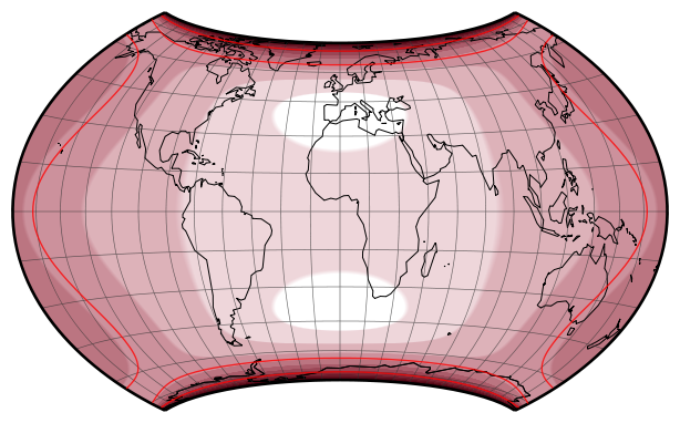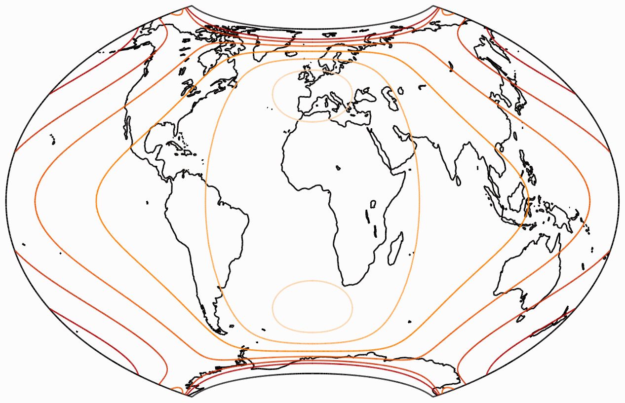Abgesehen von der üblichen Darstellung der tissotschen Indikatrix kann ich leider nur bei zwei Projektionen eine Visualisierung der Verzerrungen zeigen. Das ist ein bisschen ärgerlich, da es bei Frančulas Entwürfen gerade um niedrige Verzerrungen geht.Seit November 2021 enthält dieser Blogpost Visualisierung der Verzerrungen aller Frančula-Projektionen. In Frančulas Originaltext befinden sich ebenfalls Darstellungen der Winkel- und Flächenverzerrungen. Und da dieser Text zum freien Download zur Verfügung steht, kannst Du bei Bedarf dort nachsehen.