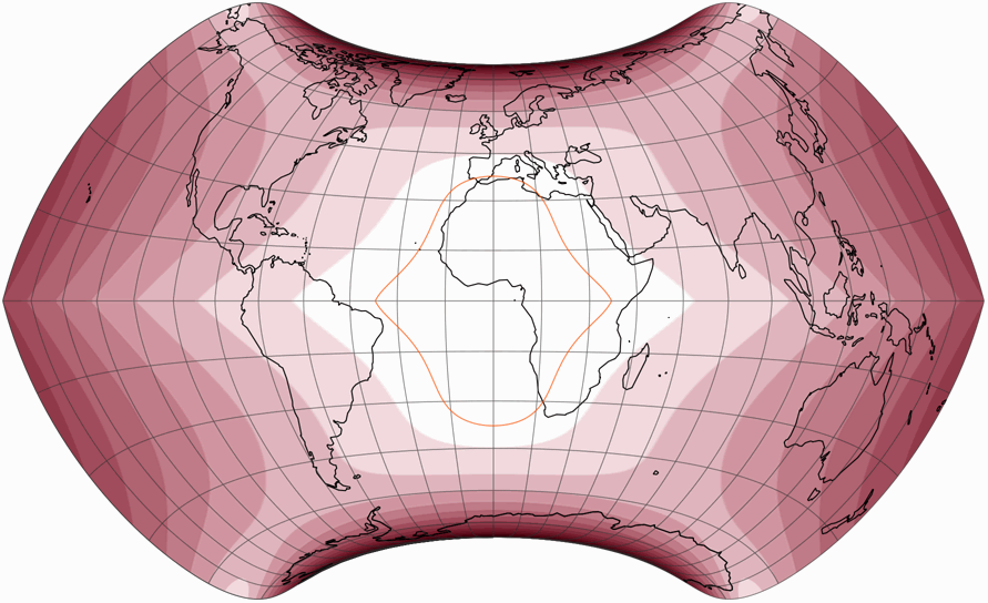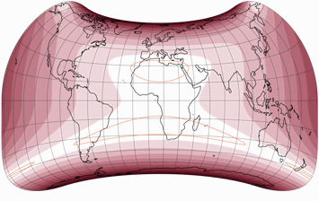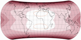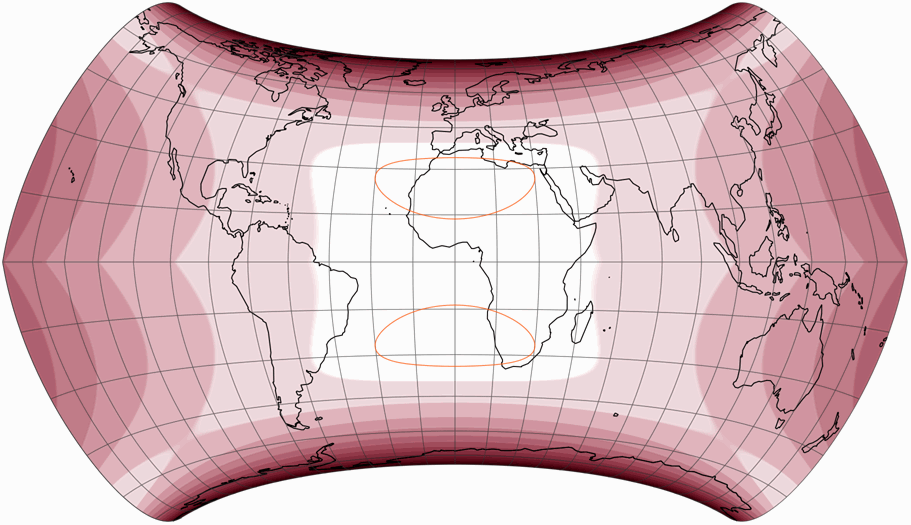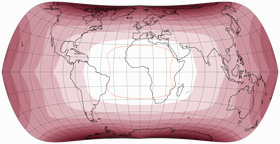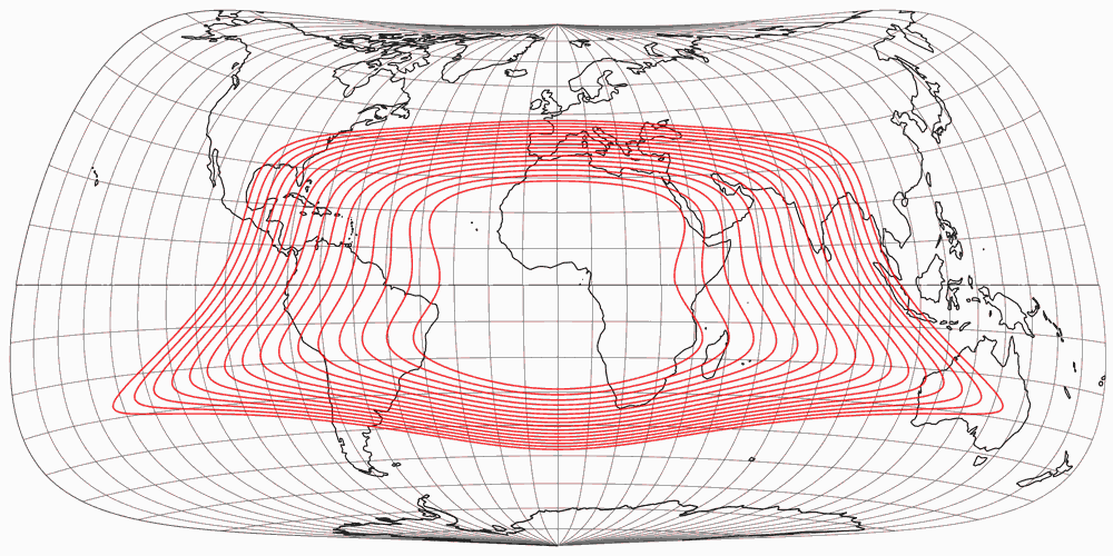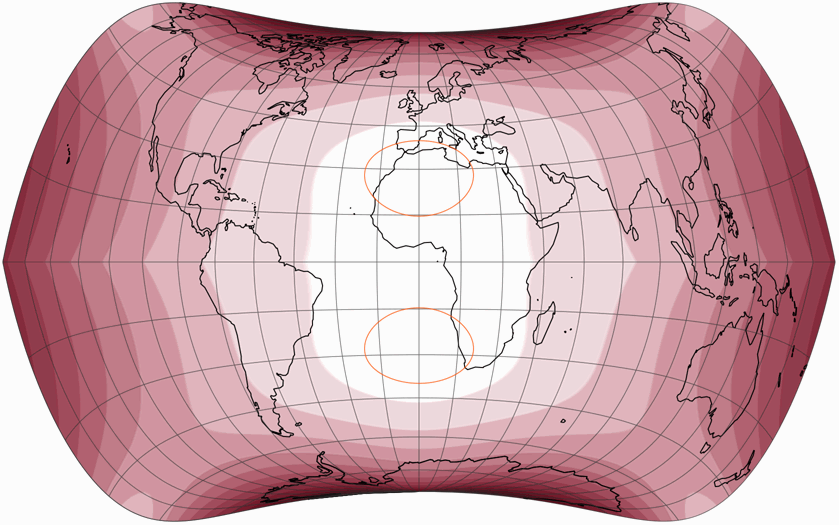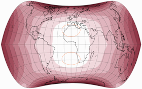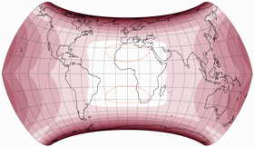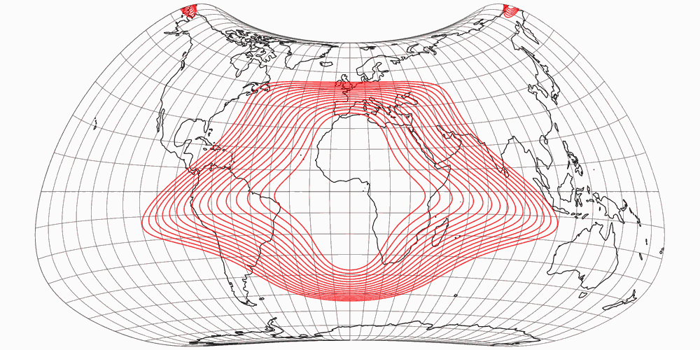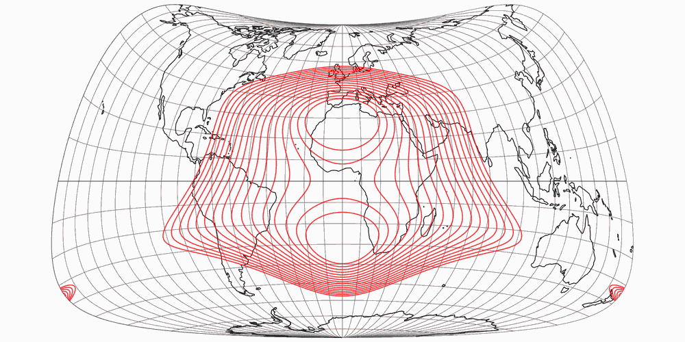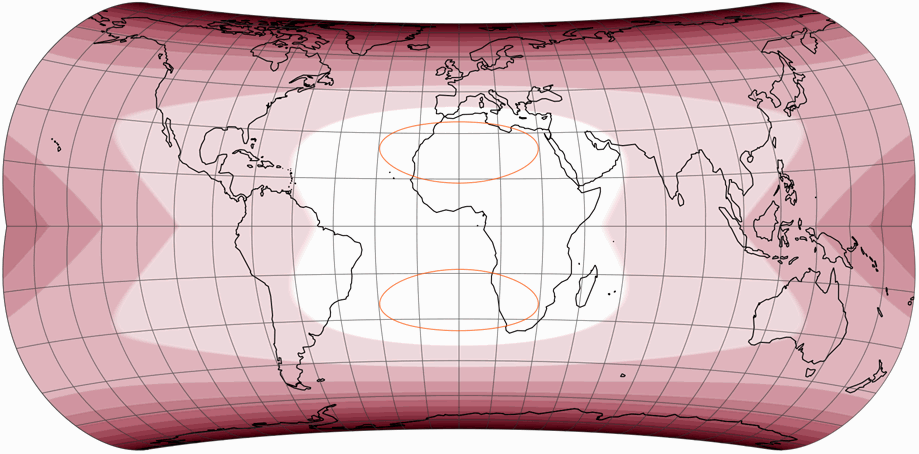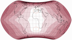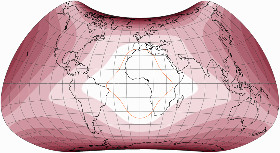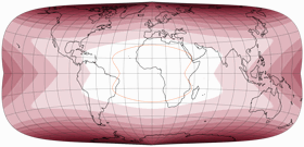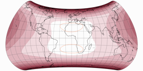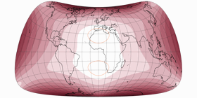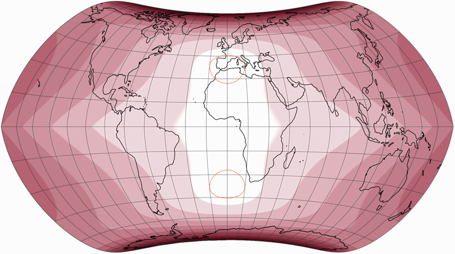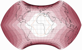Ein Hinweis noch: Die Cupola-Projektion hat ein sehr spezifisches Ziel und wurde mathematisch entwickelt, um es zu erreichen. Die Projektionen, die ich heute zeige, sind weniger spezifisch: Wie der asymmetrische Wagner VII.b bemühen sie sich nur, eine Verteilung von Verzerrungen zu erreichen, die sich für die Kontinentalflächen beider Hemisphären (mit der Ausnahme von Antarktika) als vorteilhaft erweist.