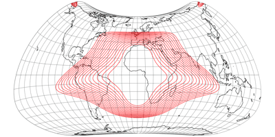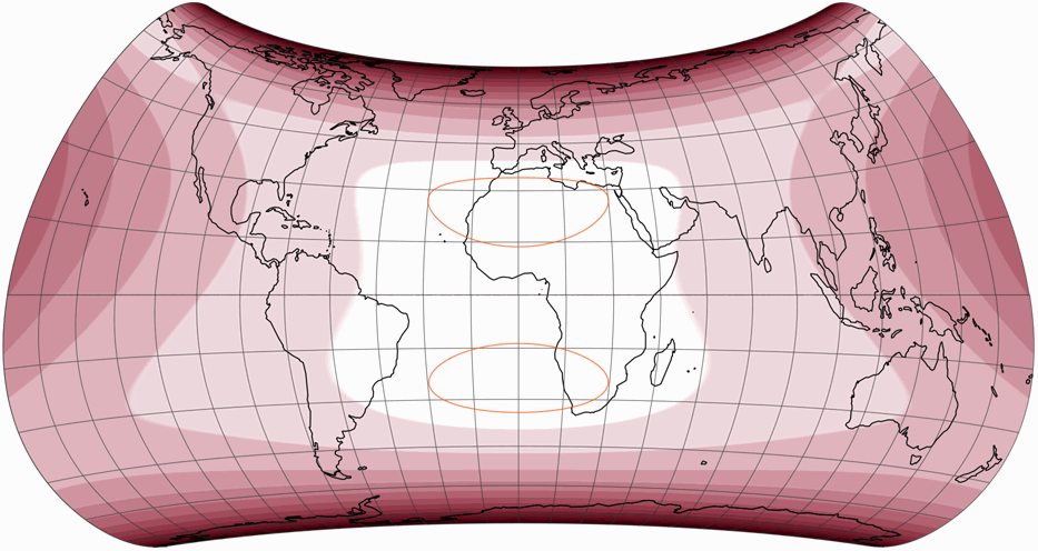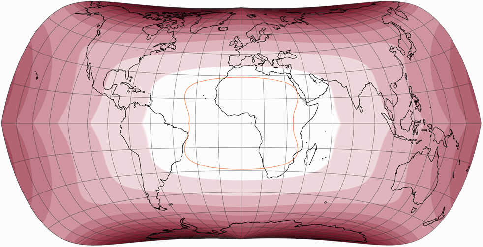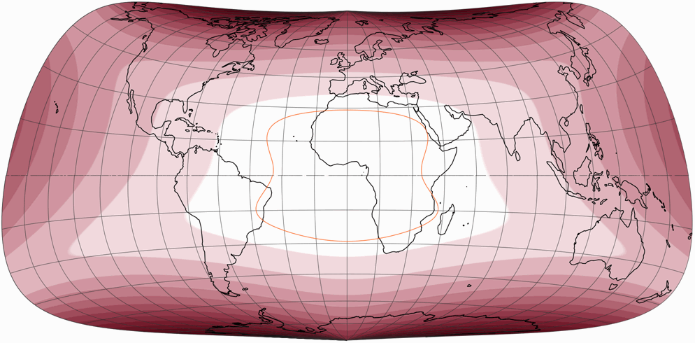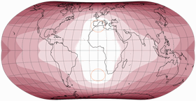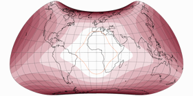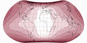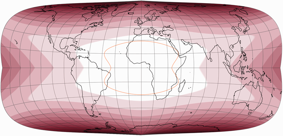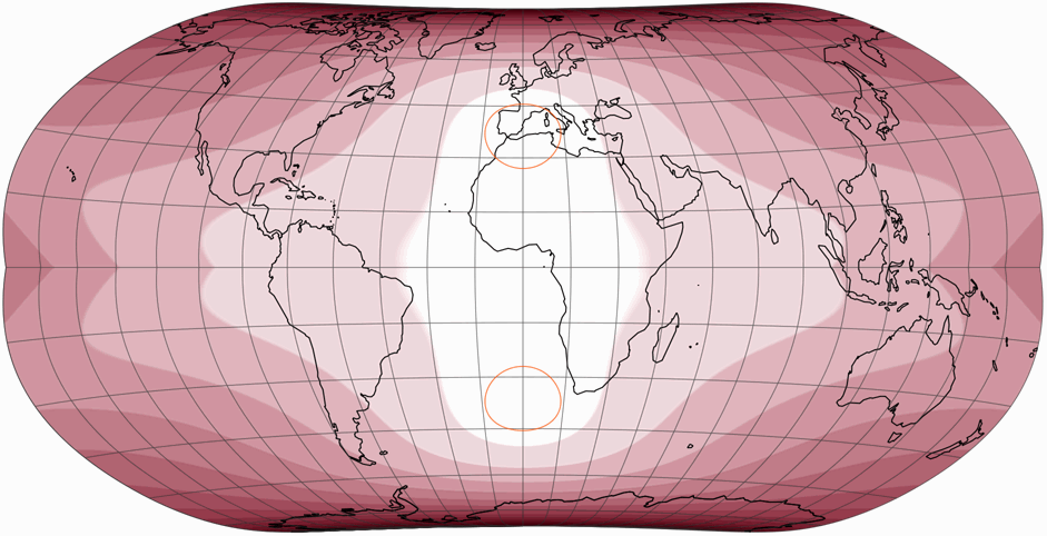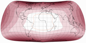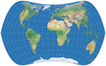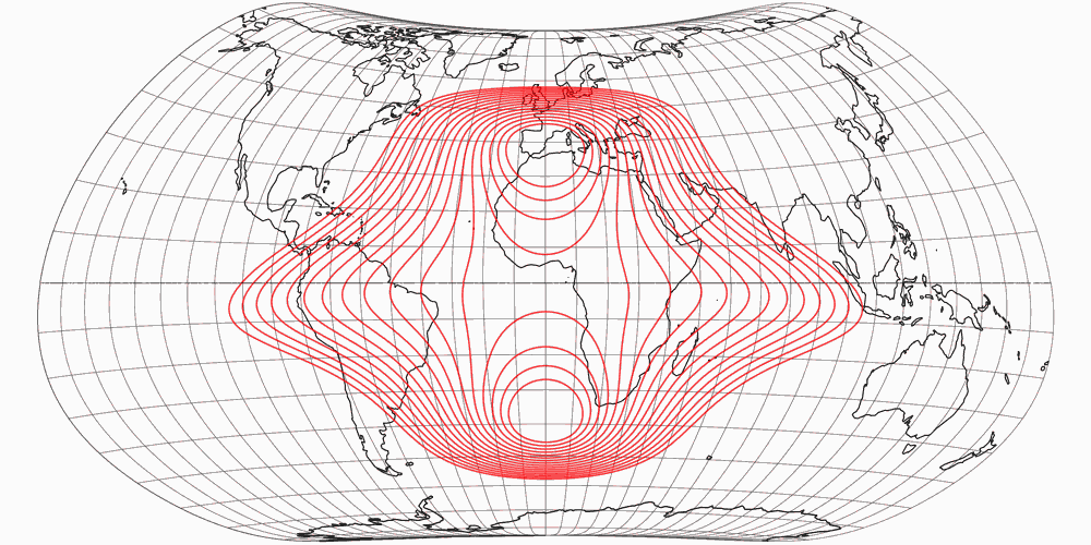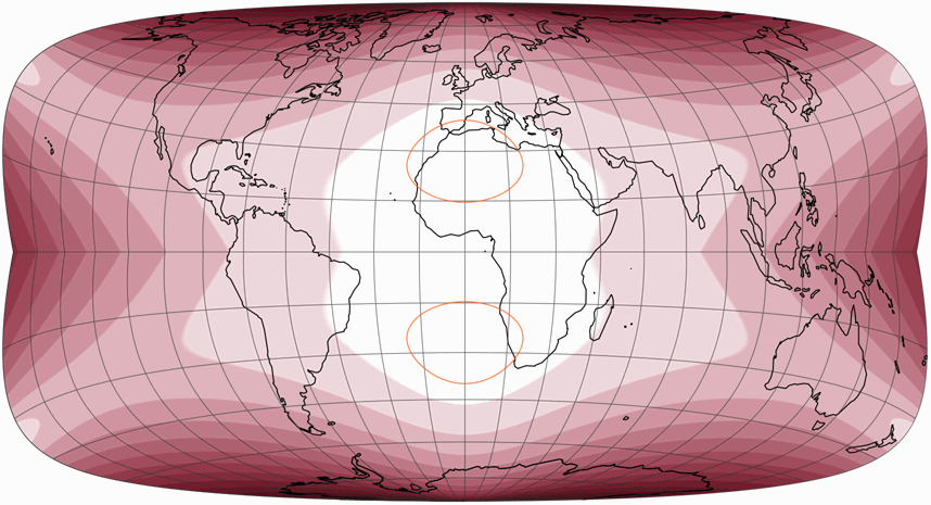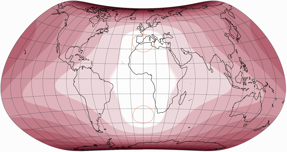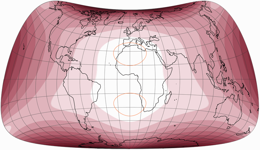 Ein Hinweis noch: Die Cupola-Projektion hat ein sehr spezifisches Ziel und wurde mathematisch entwickelt, um es zu erreichen. Die Projektionen, die ich heute zeige, sind weniger spezifisch: Wie der asymmetrische Wagner VII.b bemühen sie sich nur, eine Verteilung von Verzerrungen zu erreichen, die sich für die Kontinentalflächen beider Hemisphären (mit der Ausnahme von Antarktika) als vorteilhaft erweist.