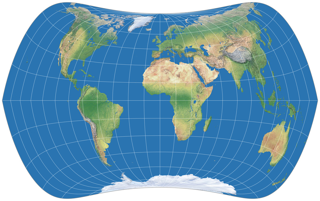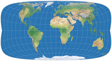 (Sinusoidal, Mollweide, Hammer, Kavraiskiy V, Snyders Minimum-Error Pointed-Pole und Flat-Pole),