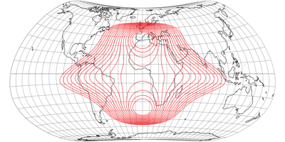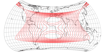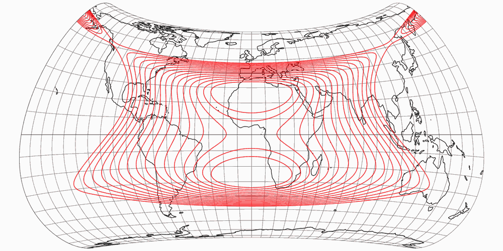 Es wurde aus den oben gezeigten Verzerrungsgrafiken eigentlich schon deutlich, aber um zu zeigen, dass die Kompositionen am Äquator keine Unterbrechungen in der Verteilung der Verzerrungen aufweisen, zeige ich hier noch Darstellungen mit Isolinien der Winkelverformungen von 5 bis 20°: