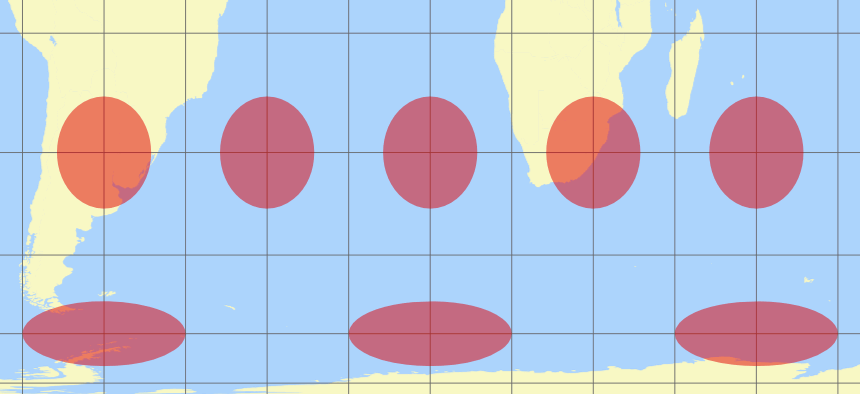 Wie Du sehen kannst, sind die roten Punkte eigentlich keine Ellipsen mehr: Der nördliche Rand hat eine andere Krümmung als der südliche, wodurch die Punkte in der oberen Reihe sozusagen »Ei-förmig« werden, und in der unteren Reihe, ääähm… ich weiß nicht, wie man diese Form nennen soll. Die Winkelverzerrungen der Hobo-Dyer-Projektion nehmen rapide zu, während man sich den Polen nähert (da es sich um eine flächentreue Projektion handelt, treten keine Größenverzerrungen auf). Am nördlichen Scheitelpunkt des (deformierten) Kleinkreises im unteren Teil des obigen Bildes beträgt die Winkelverformung 30°, während sie am südlichen Scheitelpunkt etwa 77° erreicht hat. Bei einem solchen Unterschied innerhalb des Kreises ist es kaum verwunderlich, dass er sich zu einer Form krümmt, die keine Ellipse mehr ist. Im Gegensatz dazu lässt sich diese Art der Verformung mit der echten Tissot-Indikatrix nicht beobachten. Auch das ist keine Überraschung – da die echten Tissot-Ellipsen infinitesimal sind, gibt es keine Unterschiede bei den Winkelverformungen innerhalb einer bestimmten Ellipse: