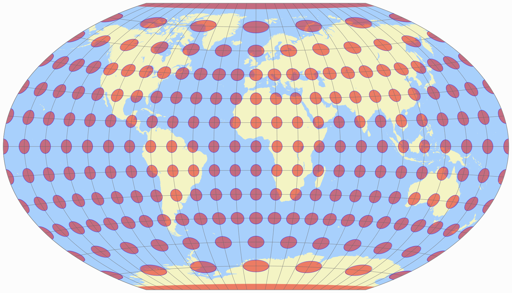 Die Grafiken verwenden keine echten Tissot-Ellipsen, sondern Kleinkreise – genauer gesagt, Entfernungskreise (Kreise gleicher Entfernung von einem gegebenen Punkt) –, um die Verzerrungen der Projektionen zu visualisieren. Die gute Nachricht ist: Das beeinträchtigt nicht den Sinn und Zweck der Grafiken; man kann sie trotzdem verwenden, um die Art und Verteilung der Verzerrungen in jeder denkbaren Projektion zu betrachten und zu analysieren! Es geht nur darum, dass sie dies auf eine etwas andere Weise darstellen; und dass ich die falsche Bezeichnung verwendet habe.