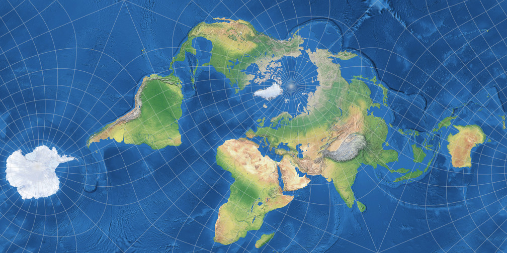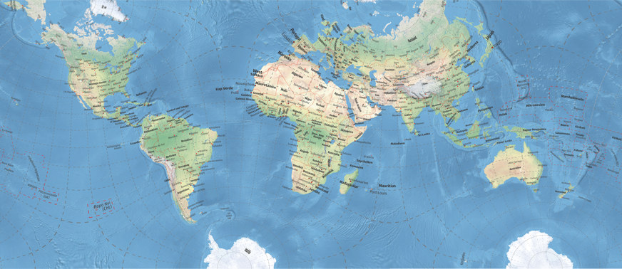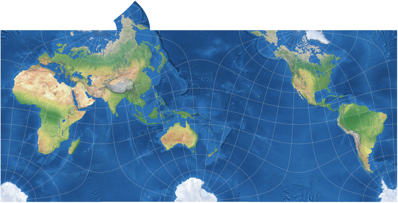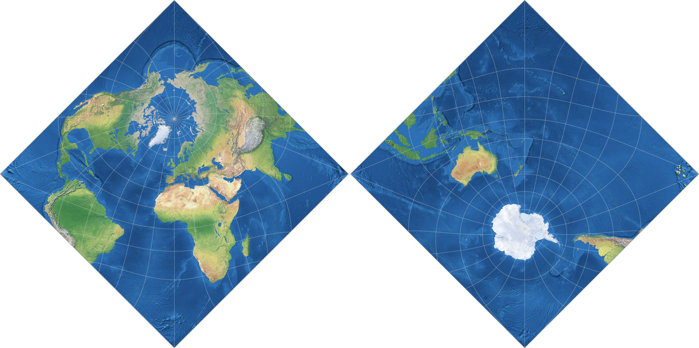 Kann man bei diesen Karten von »praxistauglichen Ergebnissen« sprechen? Die The Geocart Projection List führt die Guyou-Projektion als geeignet für »novelty maps«[6] auf, was nahelegt, dass eine einigermaßen ähnliche Karte wie Markleys eher in den Bereich der dekorativen Anwendungen fällt. Und ja, auch ich würde sie nicht unbedingt zur Verwendung in einem Atlas oder einen Bericht empfehlen (es sei denn, der Inhalt des Berichts würde nach einer winkeltreuen Karte verlangen, aber mir fällt keine Art von Bericht ein, bei der das der Fall wäre). Andererseits – stelle Dir eine allgemein-geografische Weltkarte vor, die du an deine Wand hängen willst, mit vielen Beschriftungen für Länder, Städte und physische Merkmale. Ihr Hauptzweck wäre also, Informationen zu vermitteln, aber es kann sicher nicht schaden, wenn sie darüber hinaus auch noch attraktiv aussieht, oder?