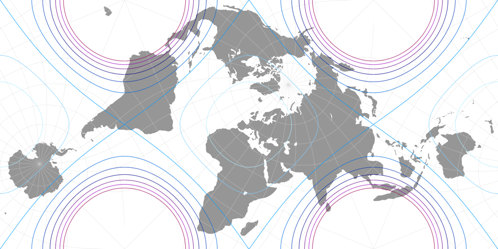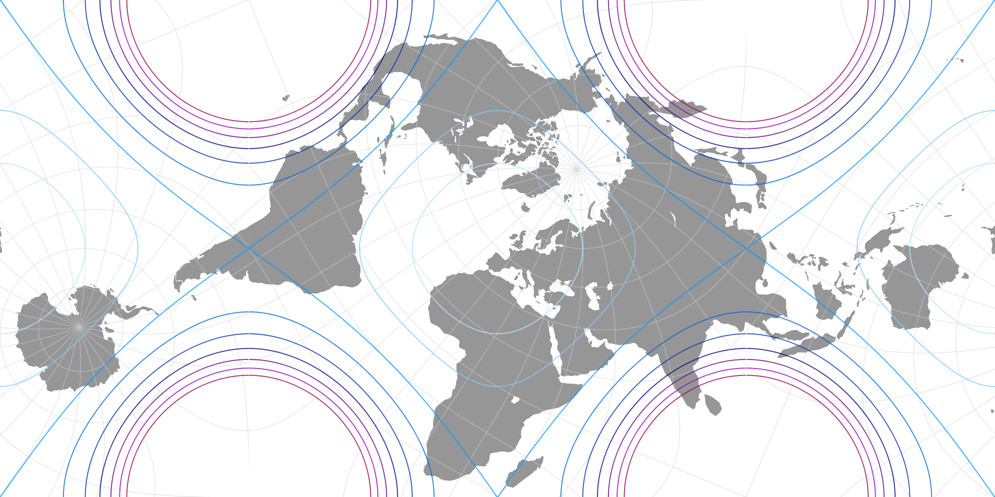 Und hier noch eine Neuanordnung einer klassischen winkeltreuen Projektion: 2019 präsentierte Björn Grieger[5] eine interessante schiefachsige Version des Peirce Quincuncx von 1879. Ein älterer schiefachsiger Aspekt von Peirces Projektion ist bekannt als Adams Hemisphären in einem Quadrat, und da der letztgenante die Welt so darstellt, wie ich es benötigte (nämlich in zwei separaten Hemisphären), verwendet ich diesen, um die triptychiale Karte zu erzeugen. Unter Verwendung von Geocart stellt sich die Konstruktion der Projektion wie folgt dar: