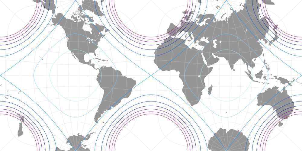 Die exakten Koordinaten für Geocart wurden von der u.g. d3-Implementation abgeleitet. Beachte, dass Kunimunes Software genau die antipodischen Werte verwendet – abgesehen davon, dass hier nur zwei Nachkommastellen erlaubt sind. Der Unterschied zu dem Längengrad in Geocart beträgt auf der Erdkugel aber nur rund 488 Meter, was bei einer Weltkarte natürlich zu vernachlässigen ist.