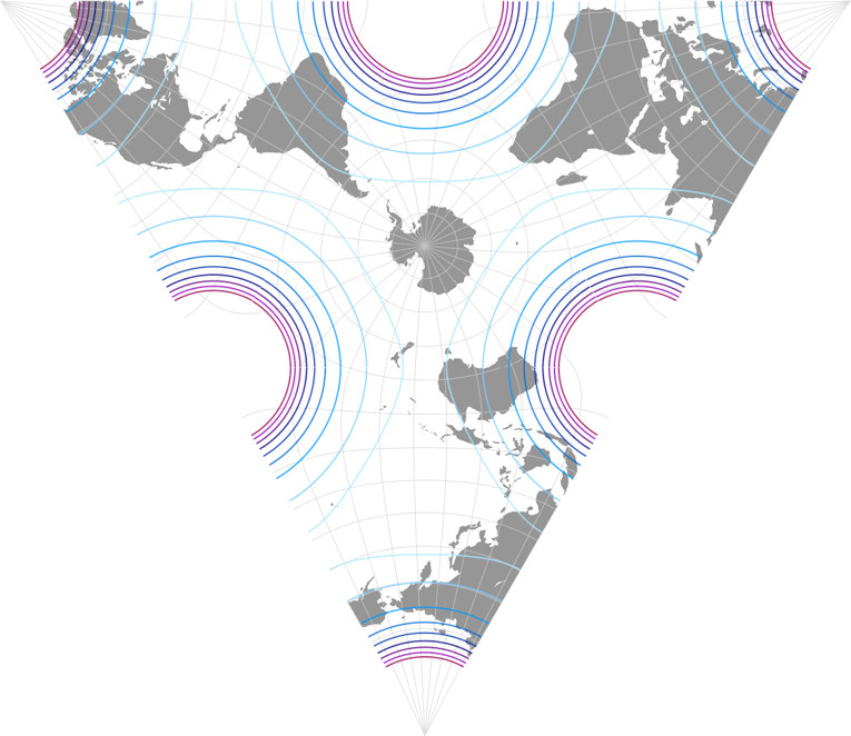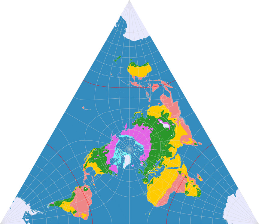 Dies trifft eventuell in geringerem Maß für die CALM und besonders Griegers Projektion zu. Letztere kann ich mir dafür gut vorstellen für solche thematischen Karten, für die derzeit gerne mal die Dymaxion-Karte verwendet wird, die z.B. die Ausbreitung des Menschen zeigen. Die Eigenschaft der Winkeltreue ist sicherlich nicht notwendig für derartige Karten, stellt aber aufgrund der geringen Flächenvergrößerungen auch kein Problem dar. Und Lee’s originale Konfiguration – nun, ich habe testweise mal eine Klimakarte erzeugt. Und irgendwie gefällt mir die Verteilung der Klimazonen, wie es vom Zentrum zum Äquator wärmer wird und dann zu den Ecken des Dreiecks hin wieder kälter. Zugegebenermaßen finde ich das unübersichtlicher als die üblichen (meist zylindrischen oder pseudozylindrischen) Klimakarten, so dass der Haupt-Einsatzzwecke von Lee’s Variante tatsächlich im dekorativen Bereich verbleiben dürfte.