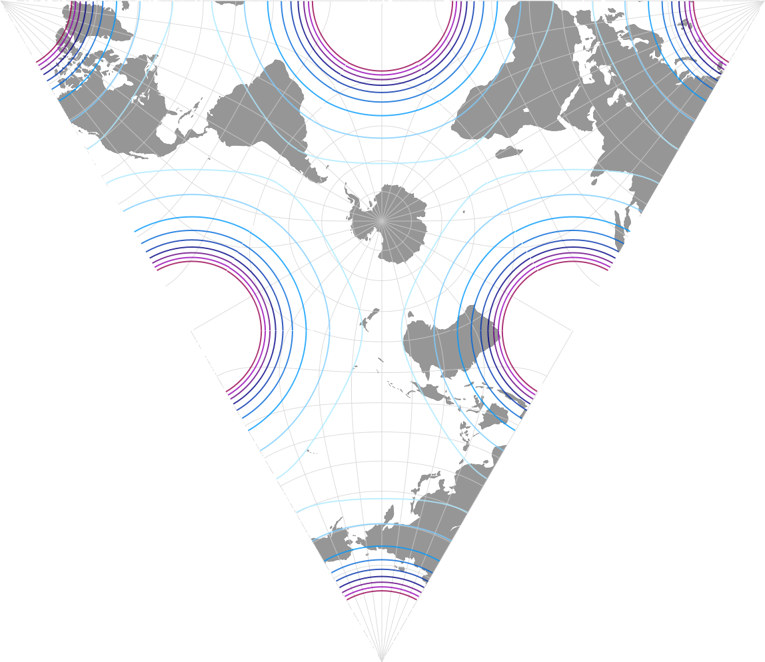 Und hier haben wir eine davon, die tetraedrische Version, 1965 vorgestellt.[1] Für die Grafik in meiner Projektions-Kollektion habe ich mich entschieden, zwei Ansichten zu zeigen, die nord- und die südpolare Lage (wie ich es schon bei anderen tetraedrischen Projektion gemacht habe, nämlich Snyders Tetraeder sowie die van Leeuwen Großkreis- und Kleinkreis-Varianten ). Laut Carlos Furutis hervorragender Website war Lee’s[2] Original auf den Südpol zentriert, leider hat er nicht Zentralmeridian genannt. Er zeige eine Grafik, die einem Zentrum auf 15°W entspricht, während Paul B. Anderson sich für 20°W entschied und Justin Kunimune eine Version mit 22.5°W in die Wikimedia Commons hochgeladen hat.