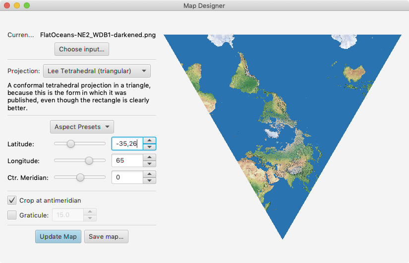 Da Kunimunes Programm nicht die einzelnen Seiten des Tetraeders, sondern eine komplette Weltkarte generiert, stellt sich das Arrangieren und Ausschneiden aus dem Zwischenergebnis etwas anders dar:
