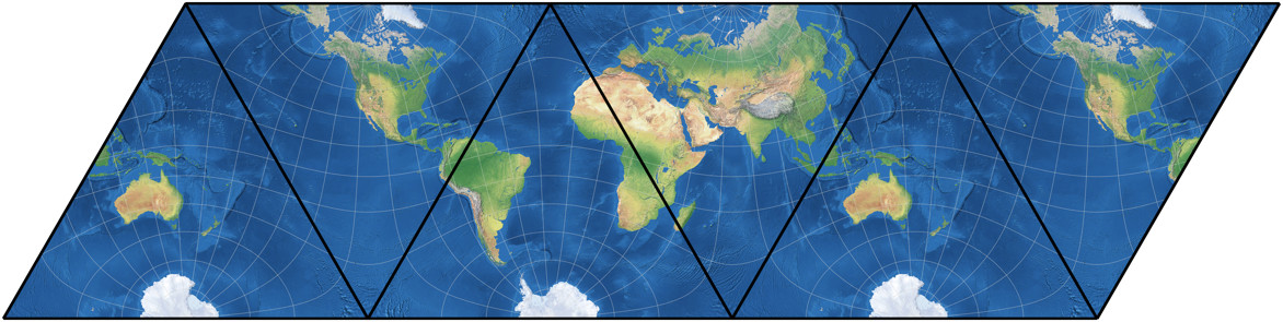 Um mir selbst einen Eindruck davon zu verschaffen, habe ich eine Weltkarte (in der Rektangularprojektion mit Schnittparallelen auf 35° N/S), die ich vor einigen Jahren angefertigt habe, umprojiziert in Markleys winkeltreuer tetraedrische Karte. Die Beschriftungen wurden dabei mit einbezogen, daher werden sie gebeugt und gebogen und zusammengedrückt und auseinander gezogen: