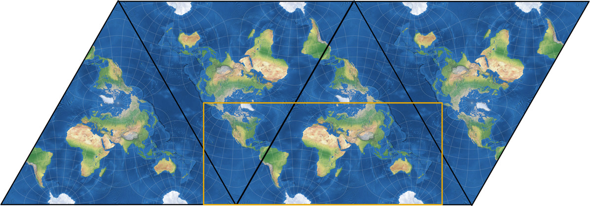 Die Anordnung der drei Kartenteile entspricht der eines Triptychons, daher der Name triptychiale Projektion. (Um ehrlich zu sein, bin ich nicht sicher, ob das Adjektiv »triptychial« überhaupt existiert, aber – wen kümmert’s? Jetzt existiert es!)