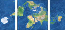 - Schneide die »südliche« Hemisphäre vertikal in zwei Hälften. Platziere die Hälfte, die den Südpol enthält, links der »nördlichen« Hemisphäre, die andere nach rechts. Füge die drei Teil-Karten nahtlos zusammen.