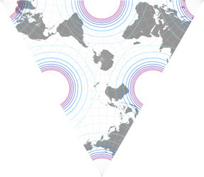 Das »Layout« der Kontinente erinnert an den Canters W23 – das überrascht nicht, denn das Ziel beider Entwürfe war es, alle größeren Landmassen ohne Unterbrechungen zu zeigen, und es gibt nicht viele Projektionszentren, die darauf hinauslaufen. Für Laien könnte diese Darstellungsweise ein wenig verwirrend sein. Das ist an sich nicht unbedingt etwas Schlechtes; es kann nie schaden, die Leute zum Denken anzuregen. Aber man sollte schon vorsichtig abwägen, für welche Art von Karten eine derartige Projektion geeignet ist.