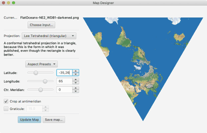 Meiner Meinung nach ergibt Markleys Arrangement eine wunderbare winkeltreue Weltkarte. Und es beweist, dass Lee’s tetraedrische Projektion zu einem praxistauglichen Ergebnis führen kann.