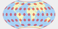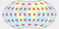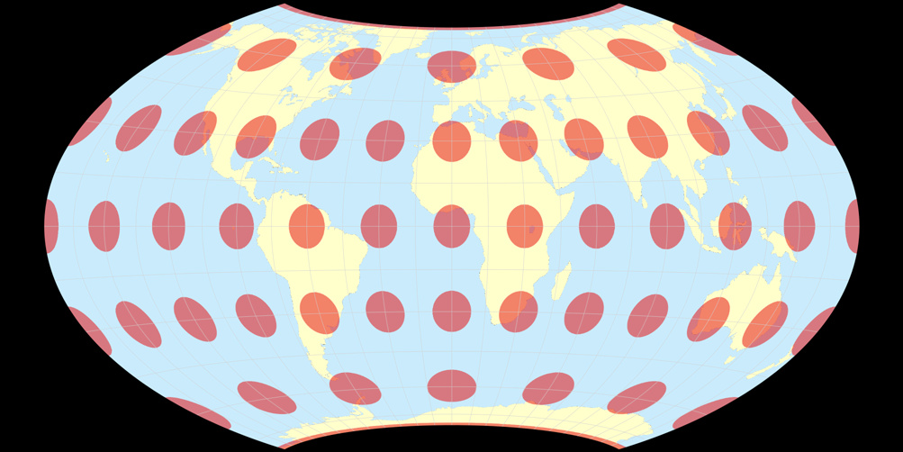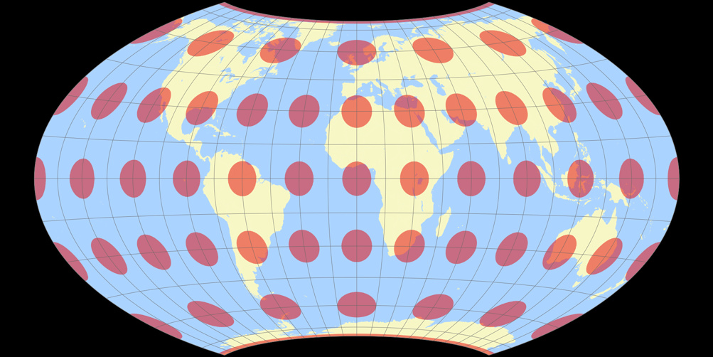 Beginnend mit den Projektionen, die ich heute hinzugefügt habe (s.u.), werde ich geänderte Grafiken für die tissot’sche Indikatrix verwenden. Ich habe die Farben geändert, um bessere Kontraste zu erreichen; das Gradnetz (welches bei der Beurteilung von Verzerrungen ebenfalls hilfreich ist) wird stärker hervorgehoben; die Artefakte an den Küstenlinien habe ich entfernt: