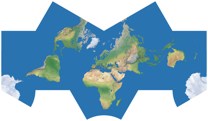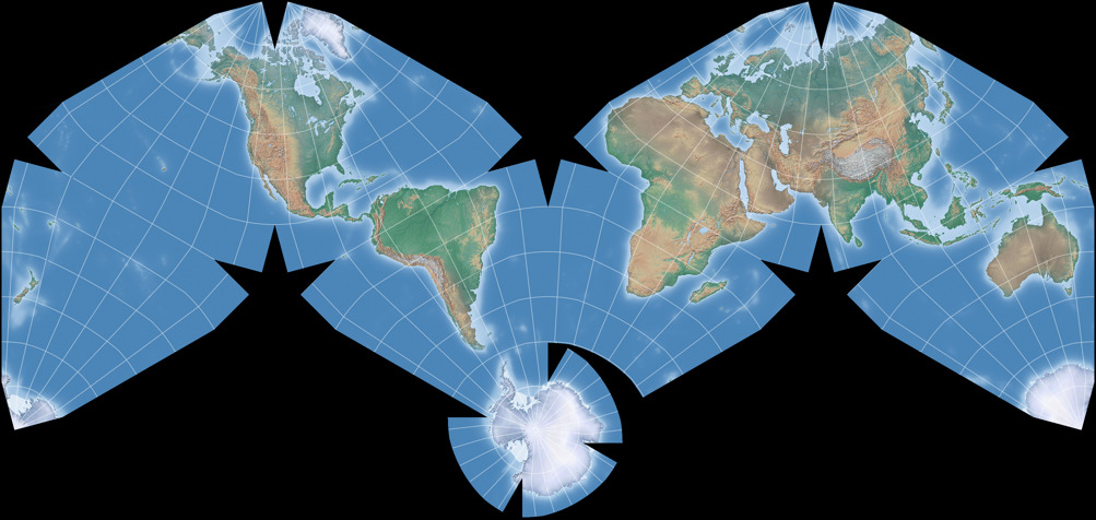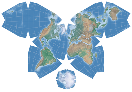 1996 veröffentlichte Steve Waterman eine Weltkarte, die aus einem auseinander gefaltetem »Globus« besteht, welcher auf einem Oktaederstumpf abgebildet ist. Das Ergebnis ist visuell ansprechende Weltkarte, die überdies erstaunlich geringe Verzerrungen zeigt (siehe unten). Dennoch würde ich sie vermutlich nicht für eine allgemein-geografische Karte nutzen, sondern eher für dekorative Zwecke. Aber vielleicht bin ich da auch nur zu konservativ?