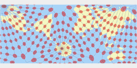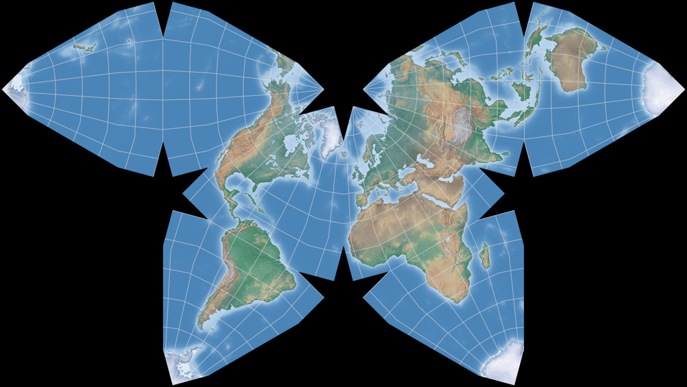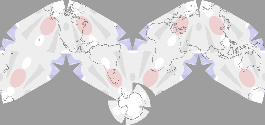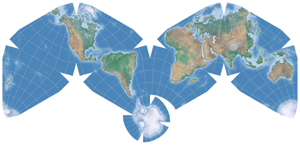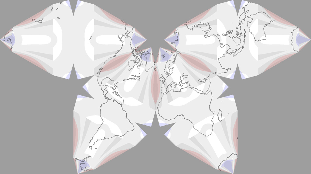 Vergleiche dies nun mit den Darstellungen von Waterman und Cahill-Keyes – dies macht die Vorteile einer polyedrischen Projektion deutlich: Weder Winkel- noch Flächenverzerrungen erreichen derart hohe Werte, wie sie bei einer vermittelnden Projektion in der üblichen (heißt: un-unterbrochenen) Art üblicherweise auftreten: