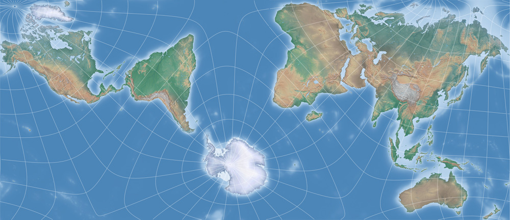 Für eine allgemein-geografische Weltkarte würde ich eher Keyes M-förmige Projektion nehmen als Watermans Schmetterling, aber das ist natürlich wiederum nur meine eigene Meinung. (Und ehrlich gesagt, würde ich letztendlich vermutlich keine von beiden nehmen.) Ansonsten bevorzuge ich im Vergleich zu Waterman zwar die Idee, dass Antarktika noch mit dem Rest der Welt verbunden ist – andererseits gefällt mir weniger gut, dass einige Teile der Antarktis doppelt dargestellt werden.