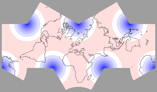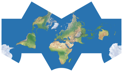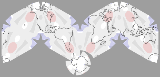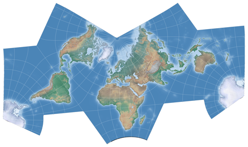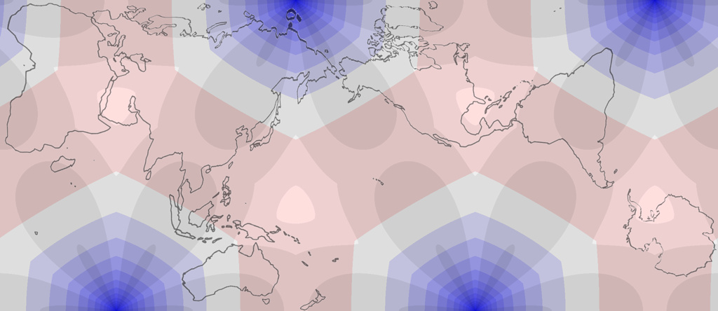 Ich muss es zugeben: Für lange Zeit habe ich die polyedrischen Projektionen etwas stiefmütterlich behandelt. Der Hauptgrund dafür war, dass ich kein Programm hatte, mit dem ich Grafiken dieser Projektionen erzeugen konnte. Das hat sich nun dank Justin Kunimunes MapDesignerRaster geändert; und also will ich Versäumtes nachholen und stelle vier Projektionen dieses Typs vor.